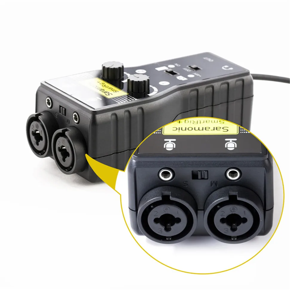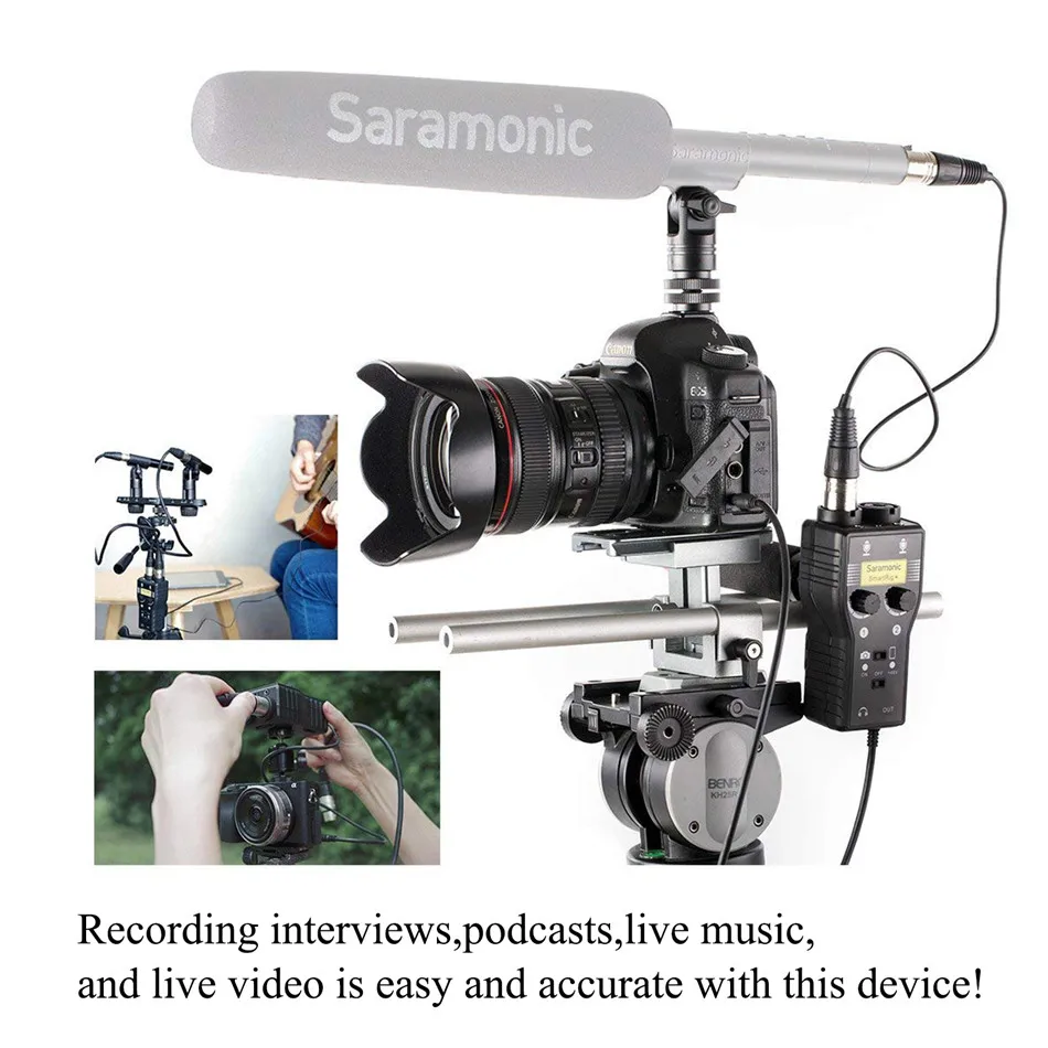 SmartRig + упрощает работу записи, подключая профессиональные микрофоны и гитары (или другие инструменты) к смартфону, планшету, DSLR камере или видеокамере. 2 независимых канала позволяют подключать и контролировать усиление на нескольких микрофонах или гитар одновременно. Интерфейс также оснащен 3 типами входов для размещения любой настройки: twoXLR mic inputs, two1/4 "(6,35 мм) гитарные входы и two1/8" (3,5 мм) разъем для подключения любого инструмента или микрофона. Выходы: помещается Стандартный 1,8 "3,5 мм кабель для использования с смартфонов, цифровых зеркальных фотоаппаратов и других устройств.