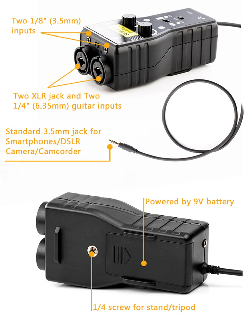 Обеспечивает 48В для микрофонов и включает в себя 3,5 мм выход для наушников для работы в режиме реального времени контроль звука. Два управления коэффициентом усиления позволяют легко устанавливать точные уровни. При необходимости переключение между режимами моно-и стереозвука. Питание от одного аккумулятора 9 В.