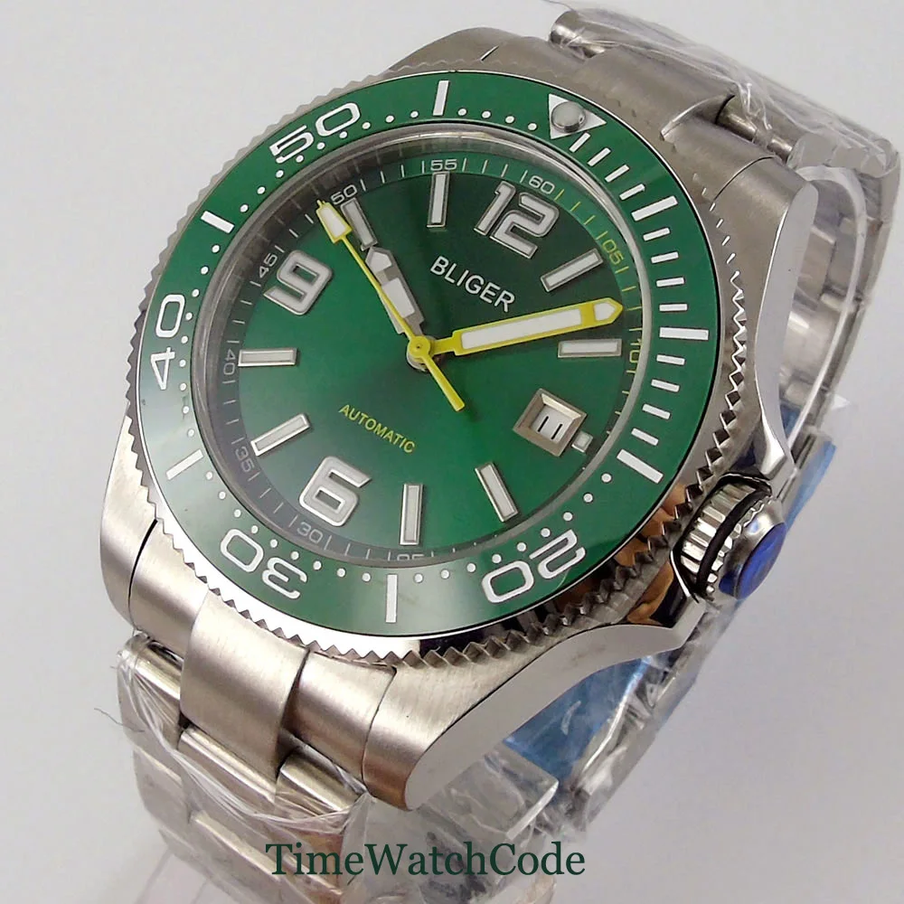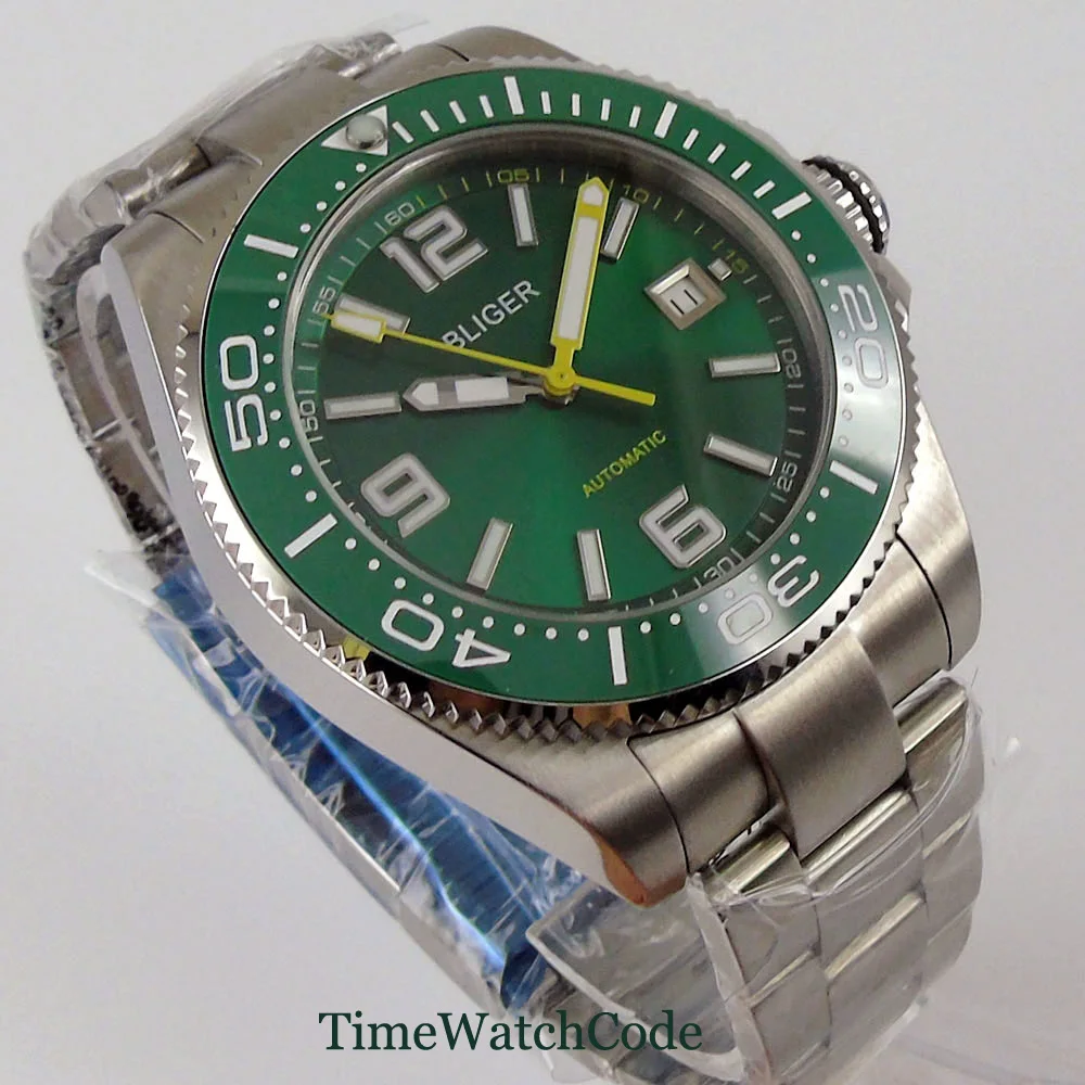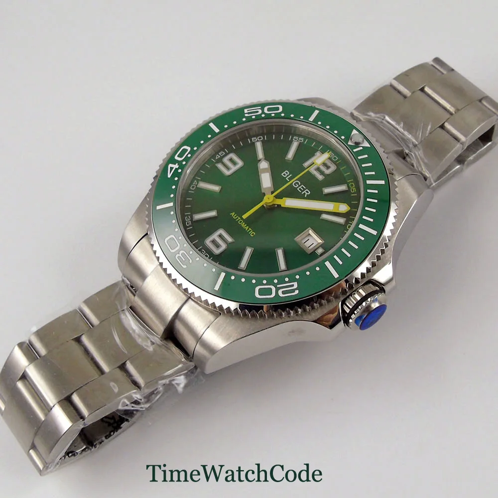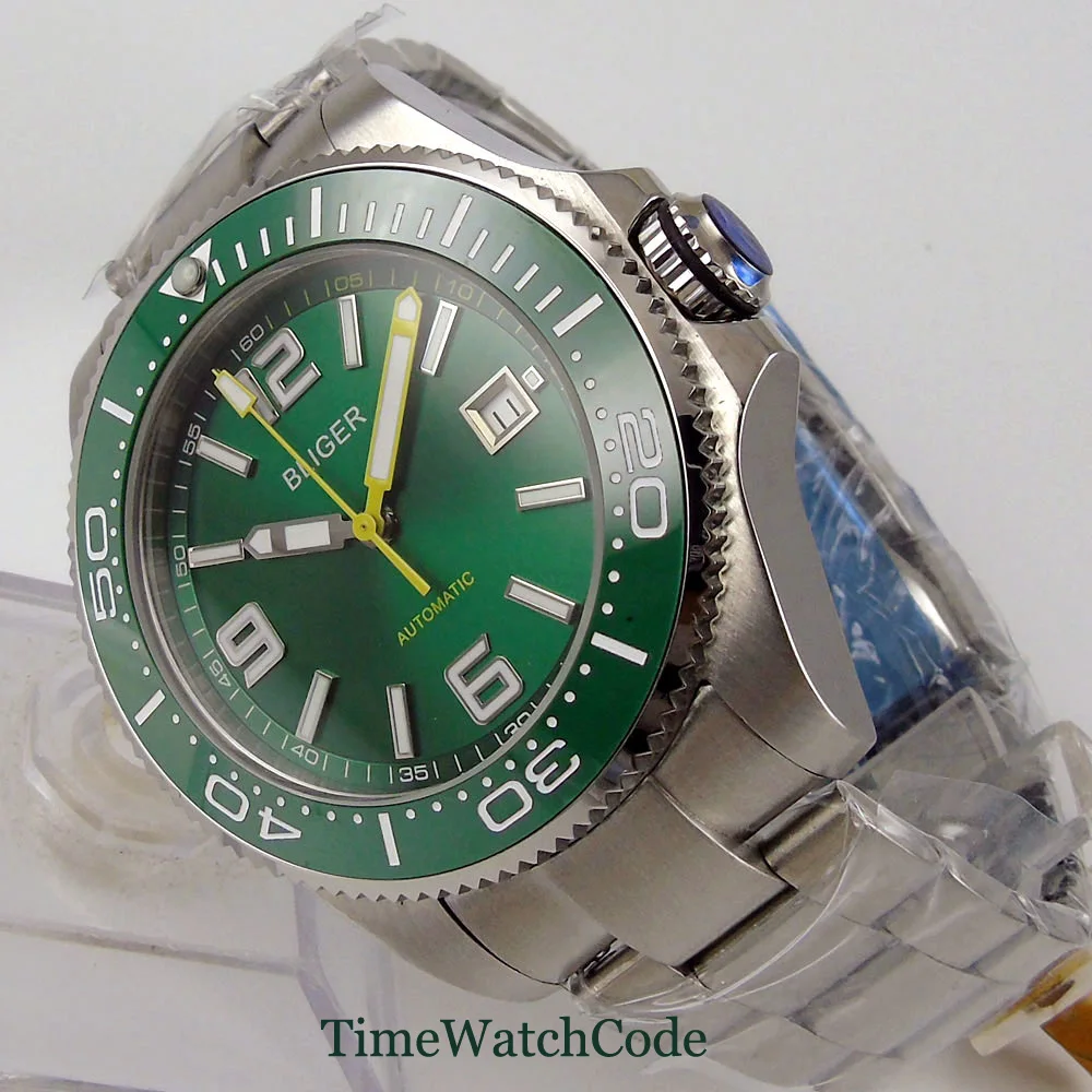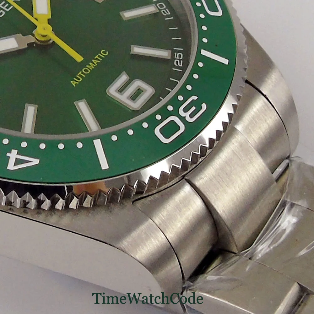> 21 jewels Mingzhu 2813 mechanical automatic (self winding) movement >21 jewels Miyota 8215 mechanical automatic (self winding) movement. --Case Size: 43 mm diameter excluding crown,14 mm thickness --Case Material: 316L fully stainless steel with ceramic bezel insert --Case Guard: 3ATM waterproof --Glass: sapphire glass --Dial : black/ green / blue color ,luminous hands and marks --Strap Size: 21.5 mm width --Strap Material: stainless steel oyster bracelet --Clasp Style : folding clasp --Function: date display at 3 o'clock position