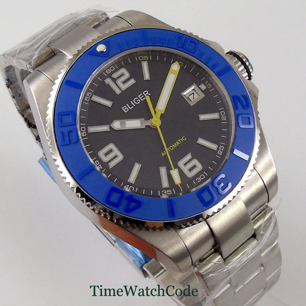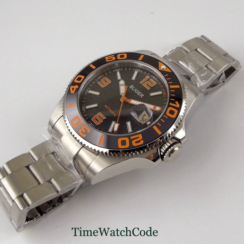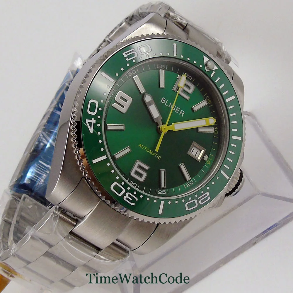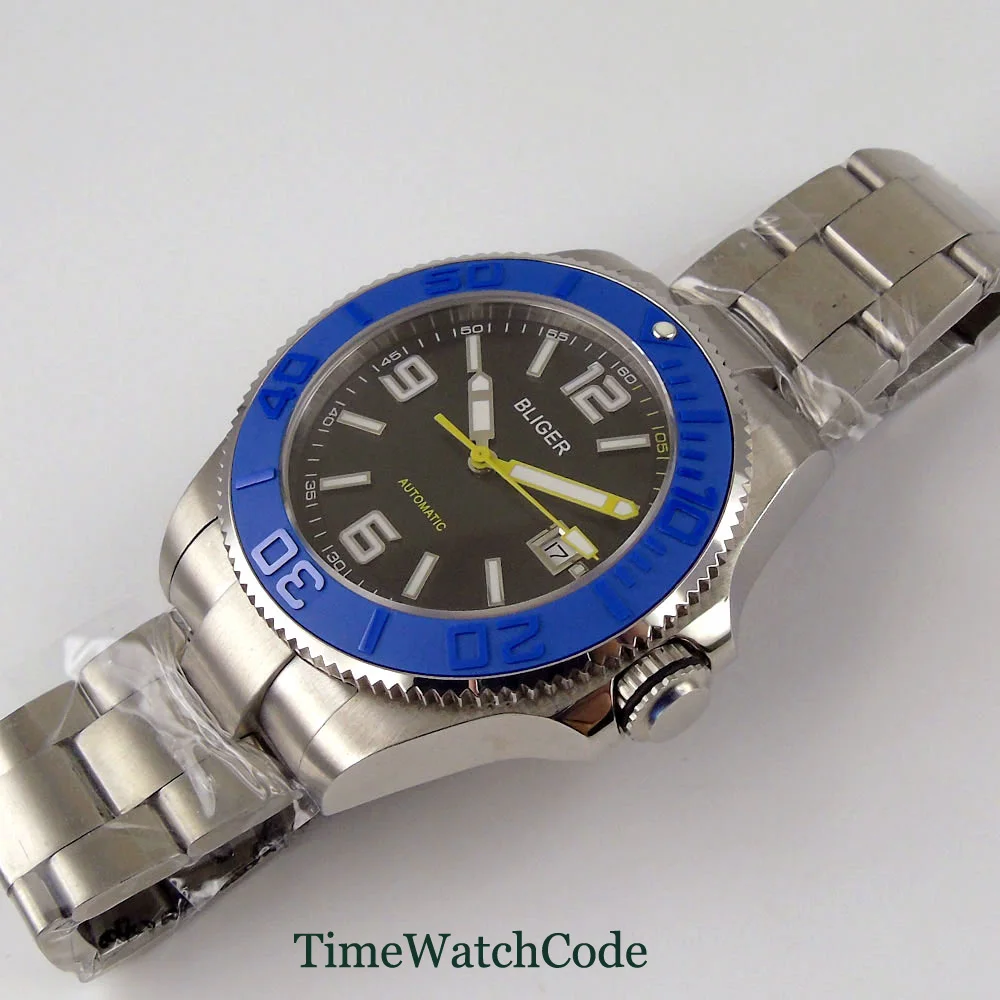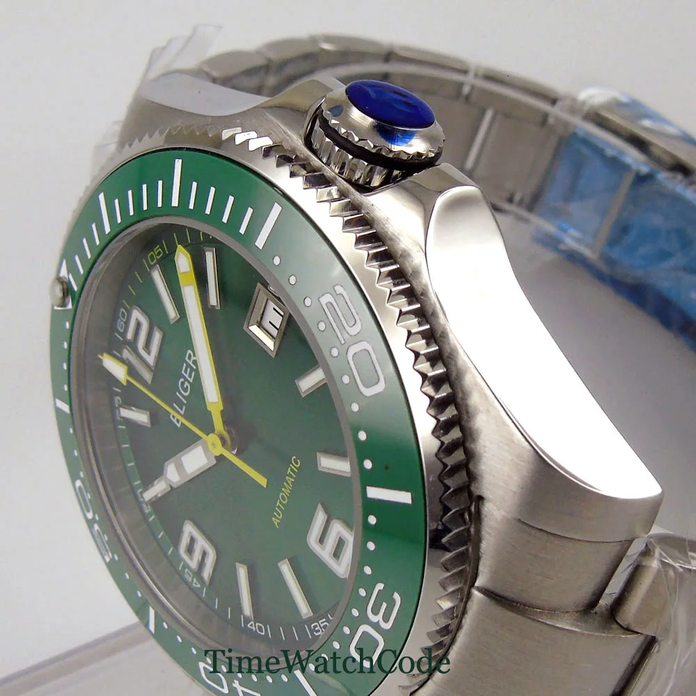 > 21 jewels Mingzhu 2813 mechanical automatic (self winding) movement >21 jewels Miyota 8215 mechanical automatic (self winding) movement. --Case Size: 43 mm diameter excluding crown,14 mm thickness --Case Material: 316L fully stainless steel with ceramic bezel insert --Case Guard: 3ATM waterproof --Glass: sapphire glass --Dial : black/ green / blue color ,luminous hands and marks --Strap Size: 21.5 mm width --Strap Material: stainless steel oyster bracelet --Clasp Style : folding clasp --Function: date display at 3 o'clock position