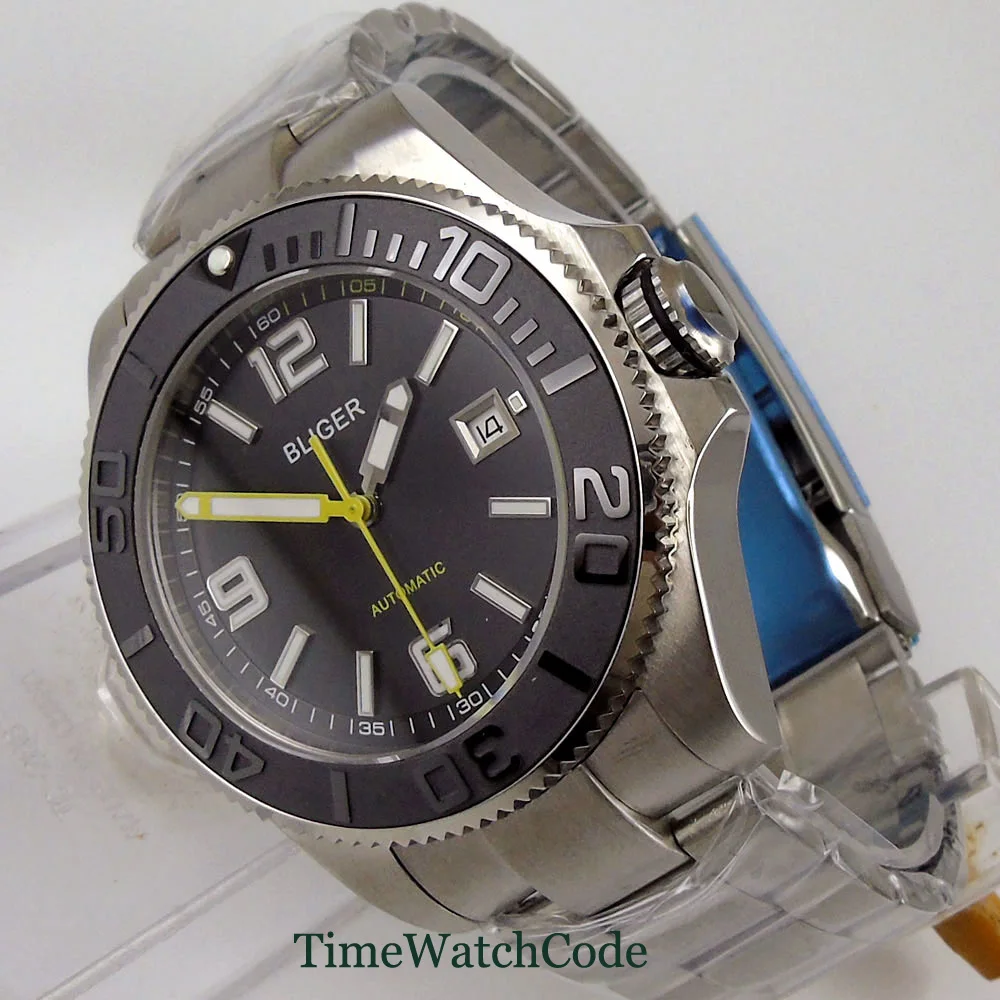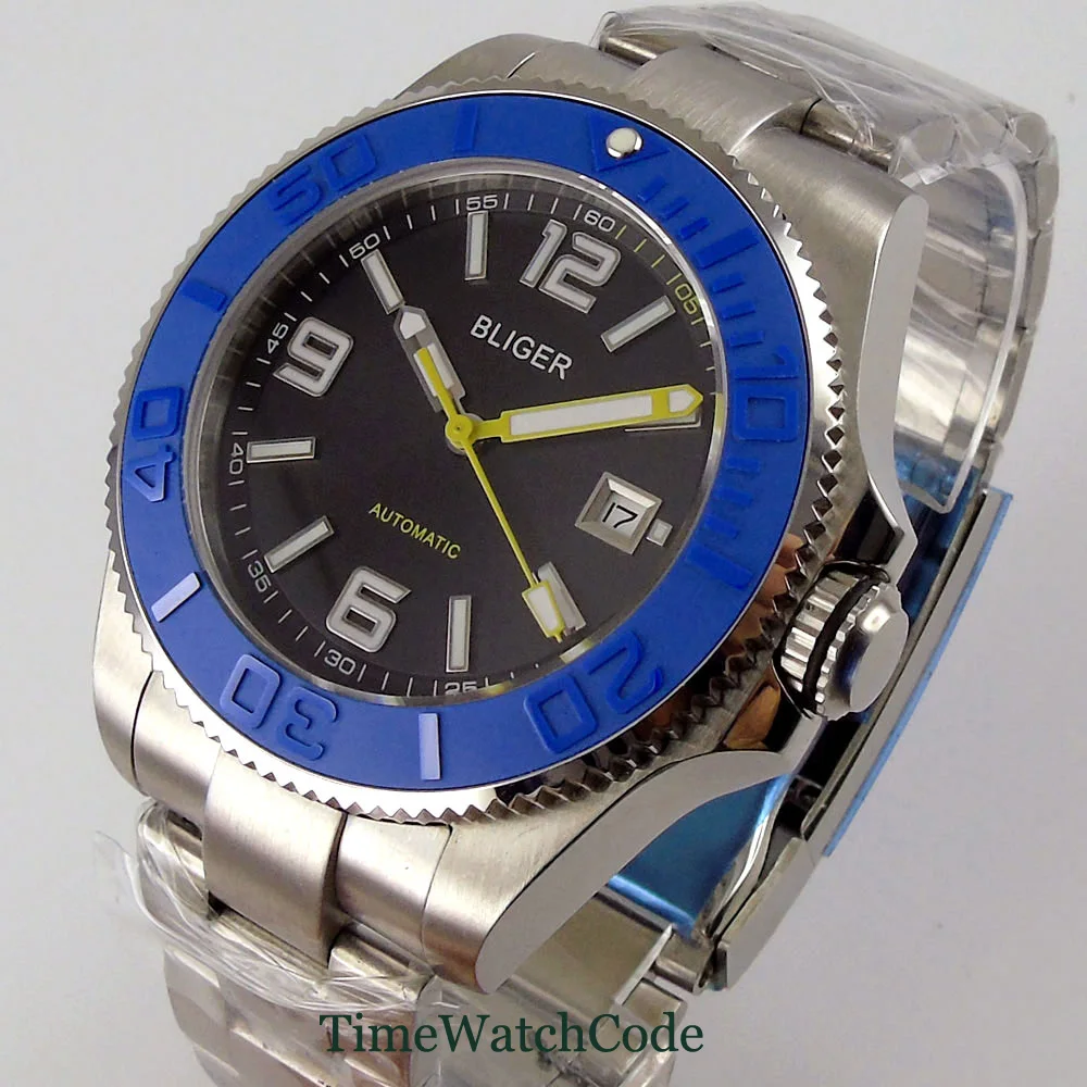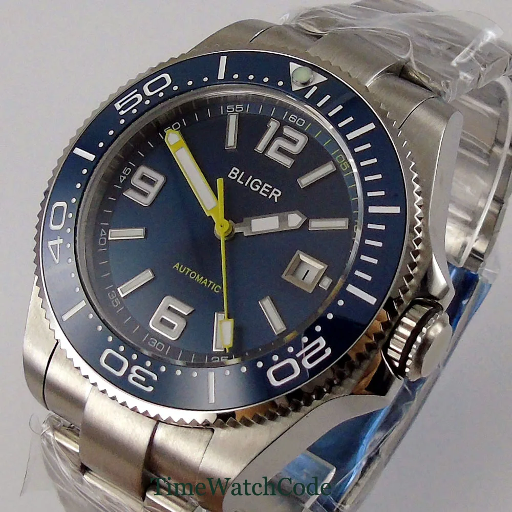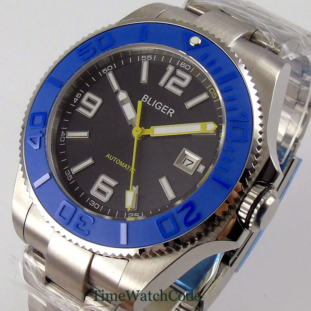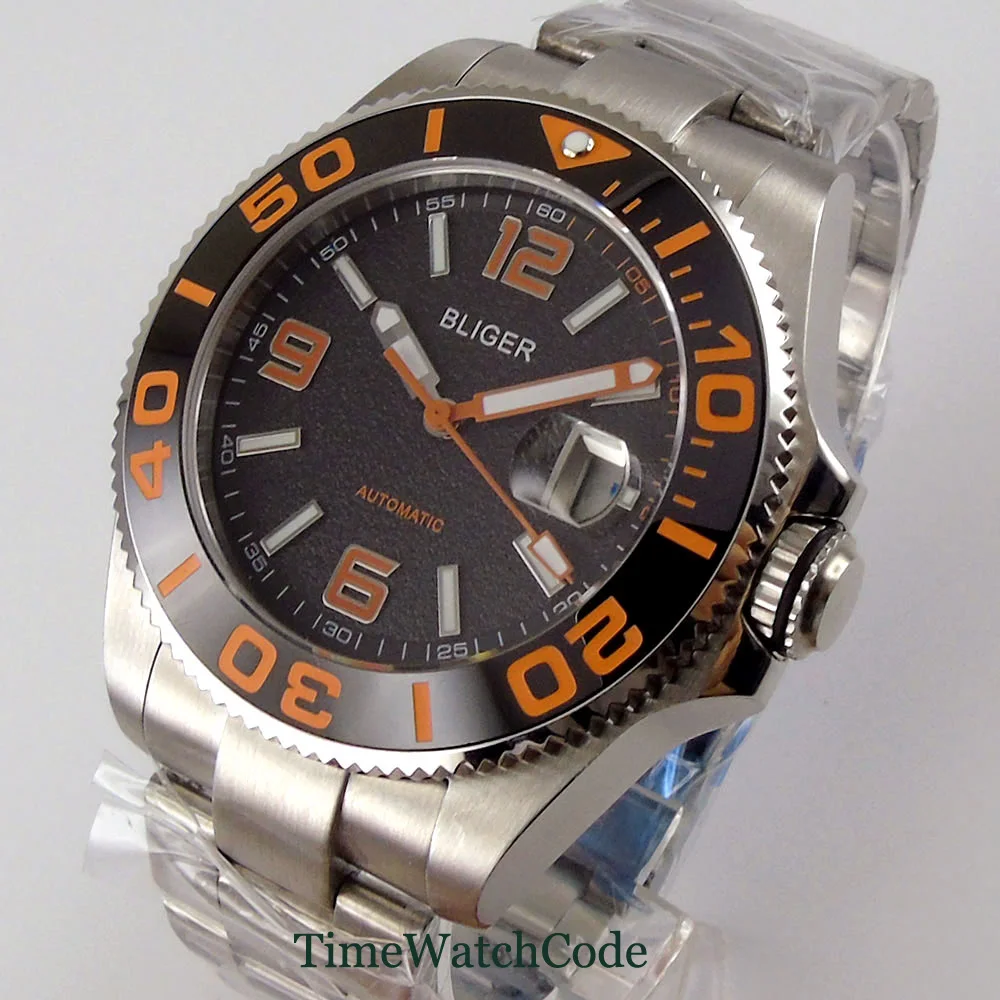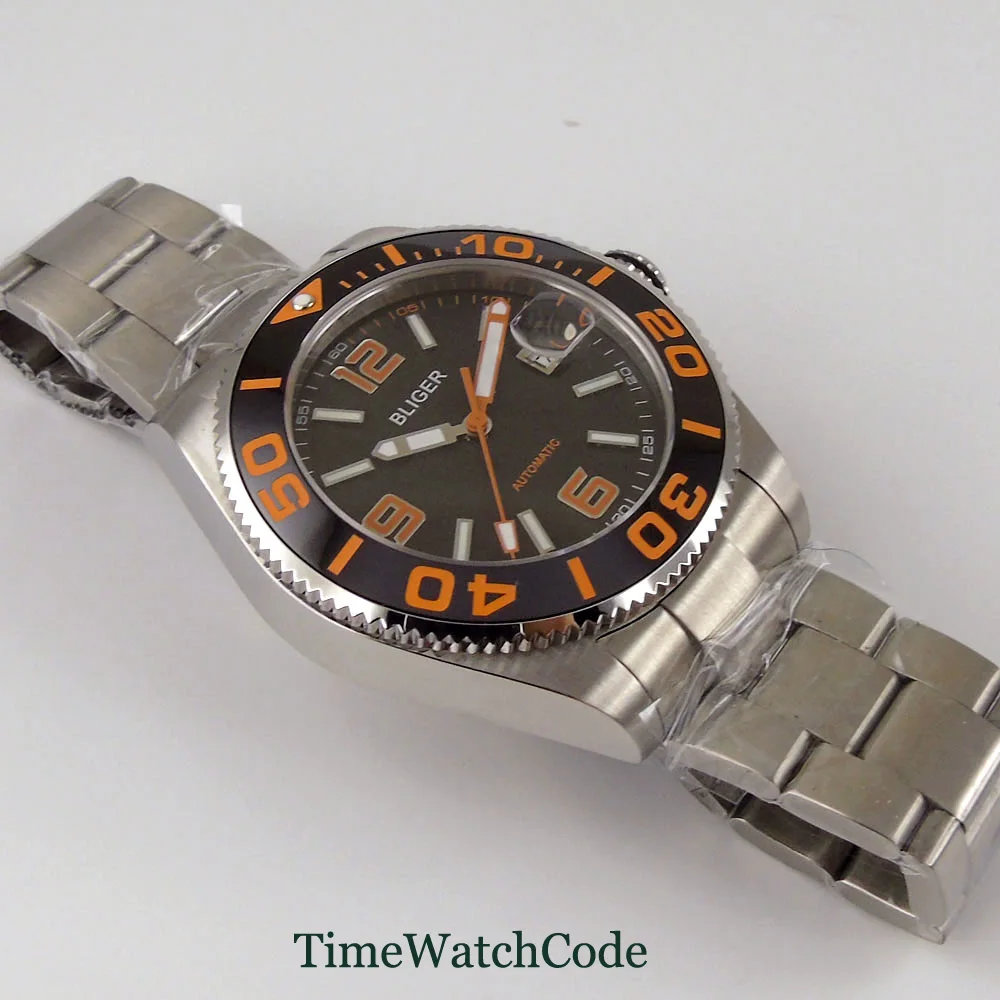 > 21 jewels Mingzhu 2813 mechanical automatic (self winding) movement >21 jewels Miyota 8215 mechanical automatic (self winding) movement. --Case Size: 43 mm diameter excluding crown,14 mm thickness --Case Material: 316L fully stainless steel with ceramic bezel insert --Case Guard: 3ATM waterproof --Glass: sapphire glass --Dial : black/ green / blue color ,luminous hands and marks --Strap Size: 21.5 mm width --Strap Material: stainless steel oyster bracelet --Clasp Style : folding clasp --Function: date display at 3 o'clock position