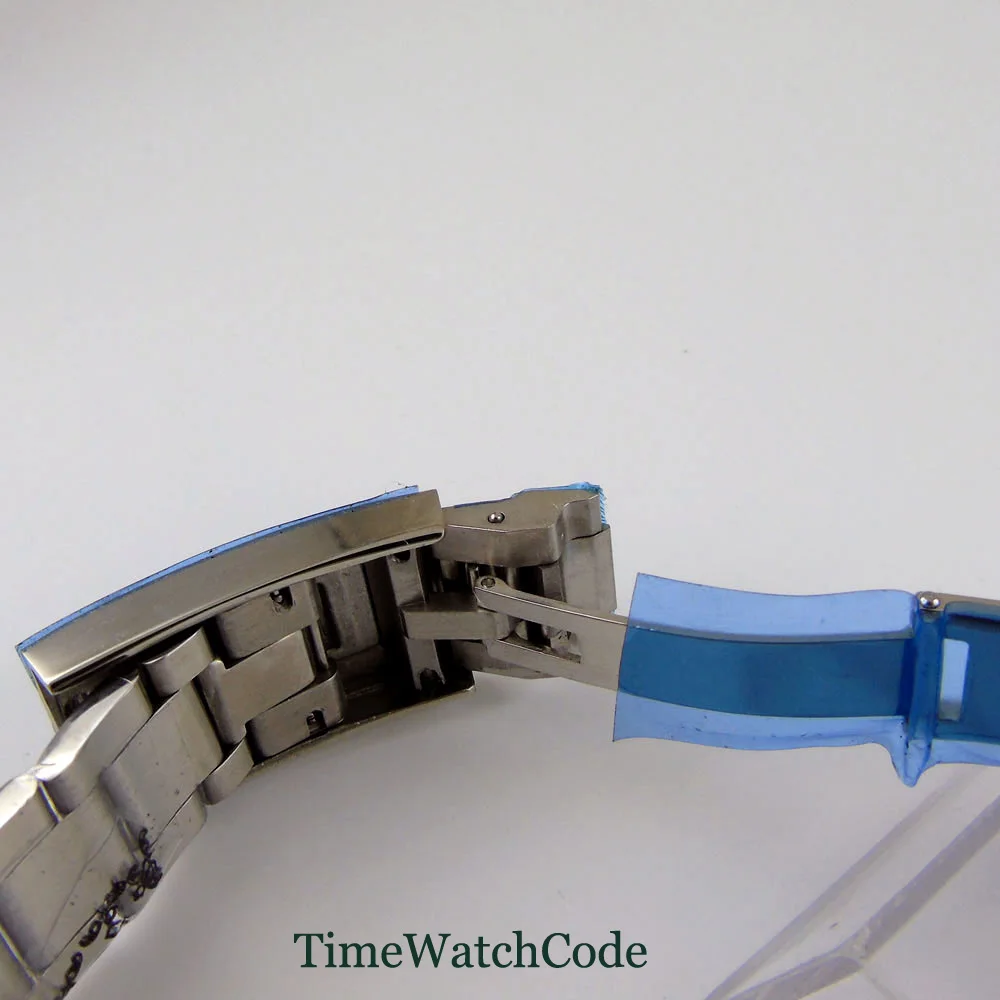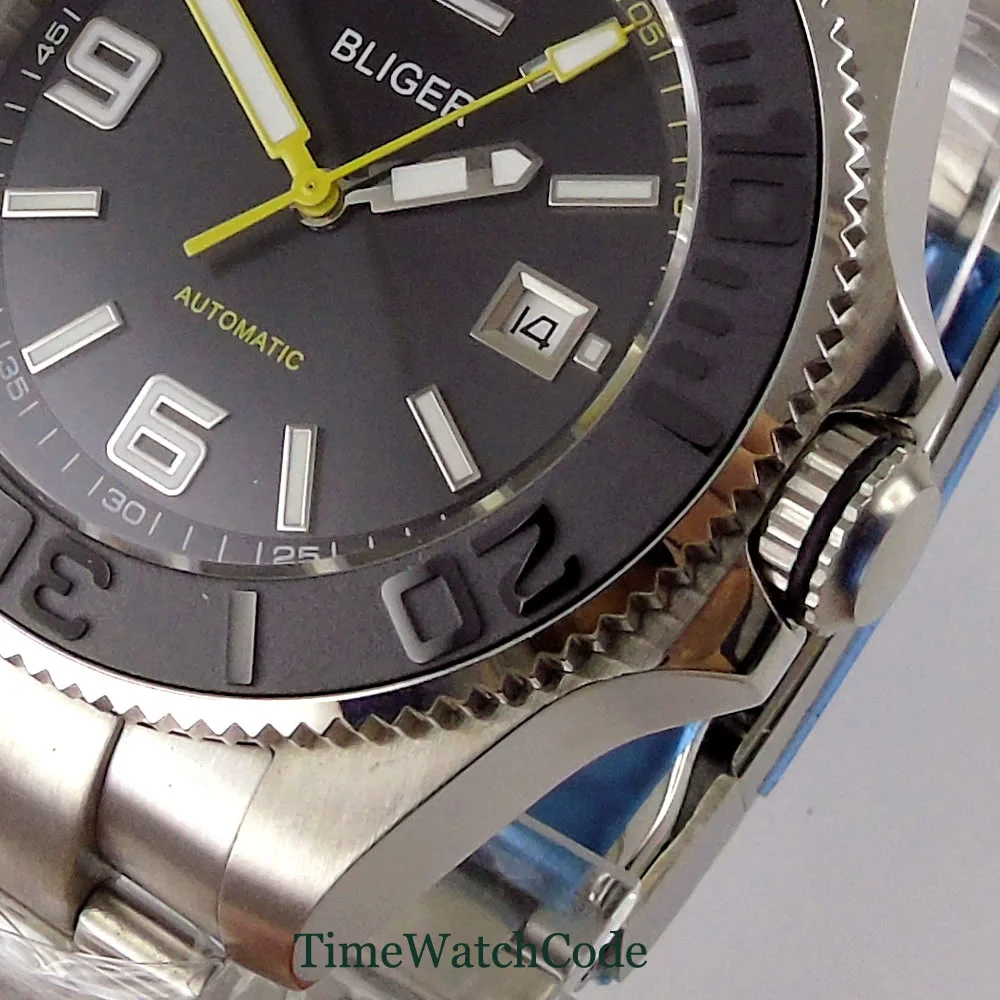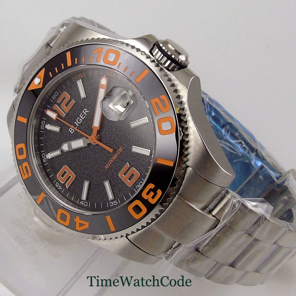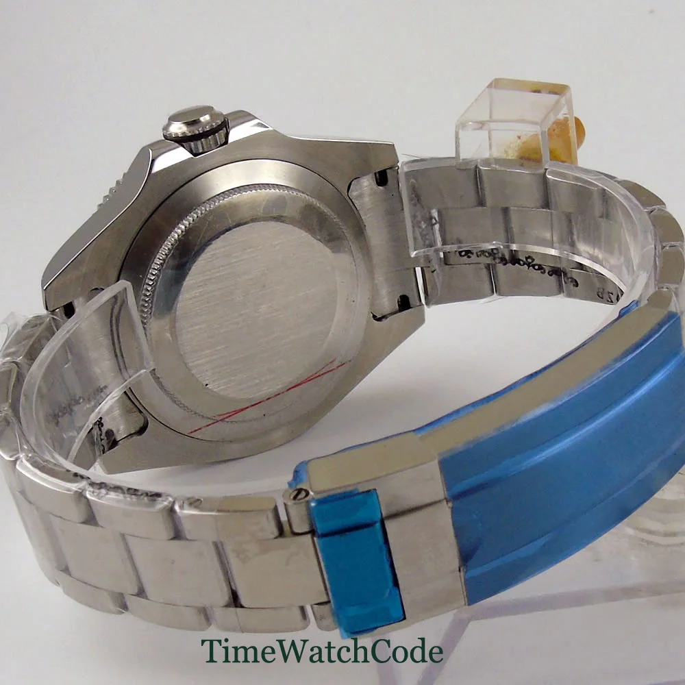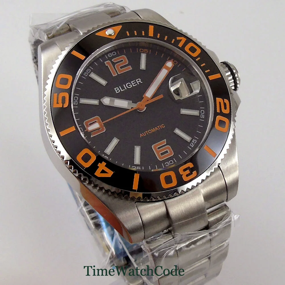 > 21 jewels Mingzhu 2813 mechanical automatic (self winding) movement >21 jewels Miyota 8215 mechanical automatic (self winding) movement. --Case Size: 43 mm diameter excluding crown,14 mm thickness --Case Material: 316L fully stainless steel with ceramic bezel insert --Case Guard: 3ATM waterproof --Glass: sapphire glass --Dial : black/ green / blue color ,luminous hands and marks --Strap Size: 21.5 mm width --Strap Material: stainless steel oyster bracelet --Clasp Style : folding clasp --Function: date display at 3 o'clock position