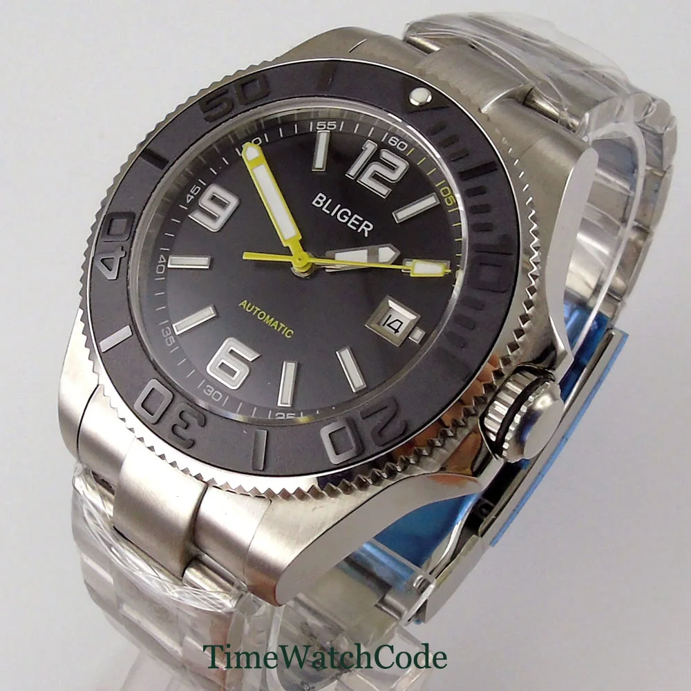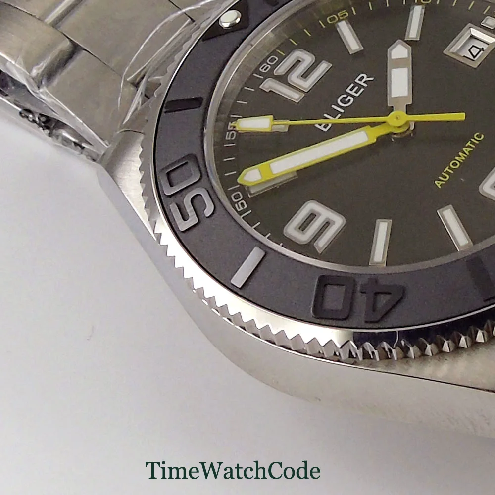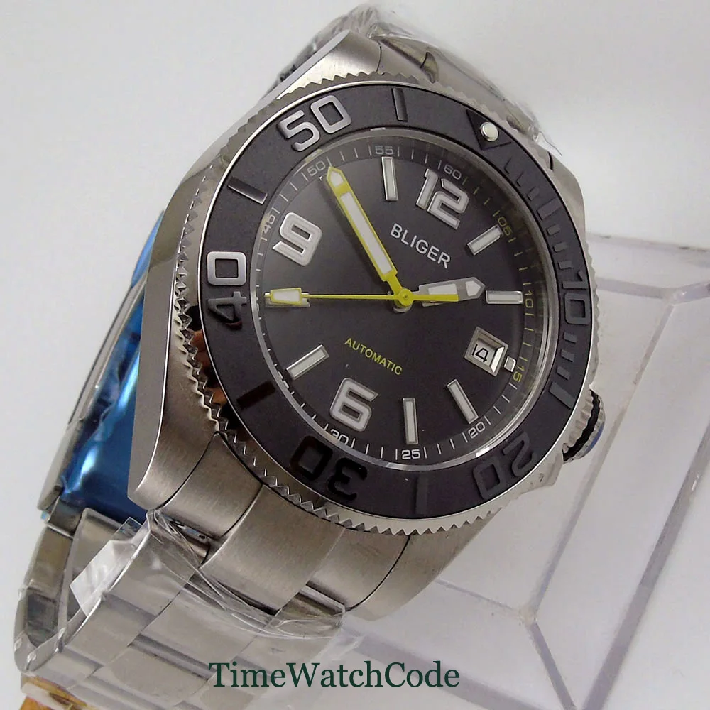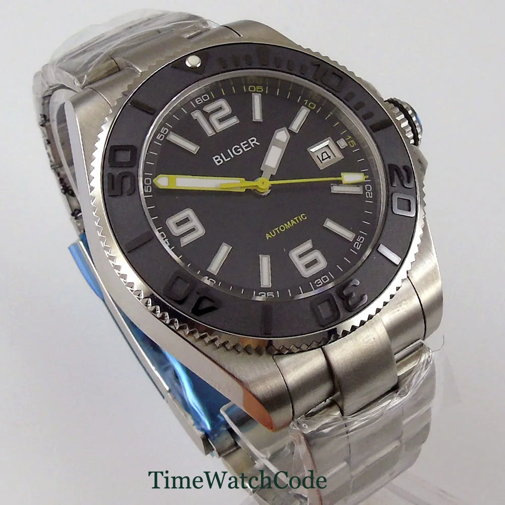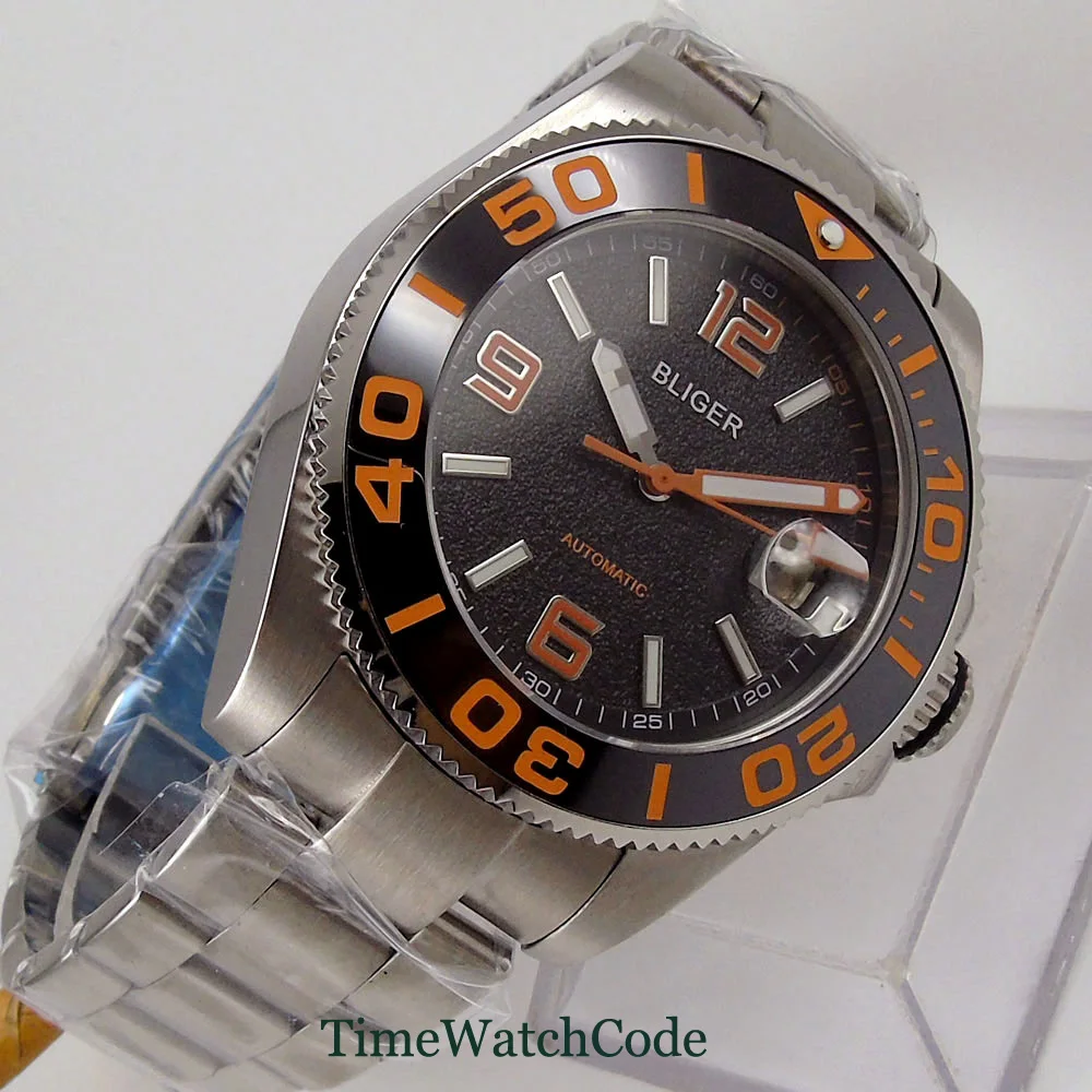 > 21 jewels Mingzhu 2813 mechanical automatic (self winding) movement >21 jewels Miyota 8215 mechanical automatic (self winding) movement. --Case Size: 43 mm diameter excluding crown,14 mm thickness --Case Material: 316L fully stainless steel with ceramic bezel insert --Case Guard: 3ATM waterproof --Glass: sapphire glass --Dial : black/ green / blue color ,luminous hands and marks --Strap Size: 21.5 mm width --Strap Material: stainless steel oyster bracelet --Clasp Style : folding clasp --Function: date display at 3 o'clock position