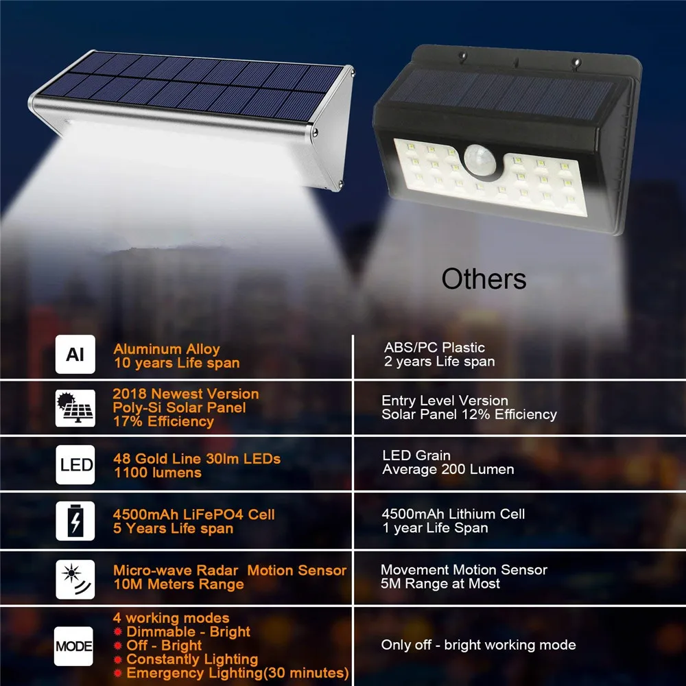 ALUMINUM ALLOY HOUSING (HIGH-END) is lightweight but sturdy. The housing is anodized for a long lasting beautiful appearance and corrosion resistance to last for years, even in harsh outdoor environments. The lampshade is made of UV resistant, anti-yellowing and heat resistance PVC material. MICROWAVE RADAR MOTION DETECTOR is a hi-tech technology based on the Doppler principle. It emits 1mm -700mm electromagnetic wavelengths to detect moving objects. 360 degree detection easily penetrates glass, wood, and stone up to 32ft. 4 WORKING MODES to handle all of your lighting needs. Dim-Bright mode, Off-Bright mode, Constant lighting mode and Emergency lighting mode. Changing modes is as simple as pushing a button. POLYCRYSTALLINE SILICONE SOLAR PANEL is a structure of PET lamination. It includes a larger surface area and can absorb sunlight much faster allowing for a quicker charge. Explosion-Proof, non-memory, rechargeable 3000mah lithium ion battery last up to 12 hours of continuous lighting. Tips: - The On/Off switch is on the LED Cover, please press the button 5 seconds to turn the light on. - Make sure you have the solar panel fully exposed directly to sunlight, especially in the winter or rainy and cloudy days. - If you install 2 lights in same location put them 10’ apart to avoid electromagnetic wave interference. 4 Working Modes - Dim & Bright Mode: Light is Dim until motion sensor is triggered then the light turns on super bright. - Off & Bright mode: Light is Off until motion sensor is triggered then the light turns on super bright - Constant lighting mode: Light is on 30% brightness constant, no motion sensor function - Emergency mode: Light is super bright and lasts 30 minutes and then shuts off. Product Specifications - Output: Maximum 700 Lumens when 100% full charged - Solar panel: 5V 3.2W - LED source: SMD2835*48PCS - Battery: Lithium ion phosphate battery 3.2V 3000mAh. Explosion-Proof, non-memory - Color temperature: Cool white, Warm white - Sensing distance: 16-32ft - Working time: Microwave radar Radar sensor works more than 500 times (15 seconds each time) - Waterproof level: IP65