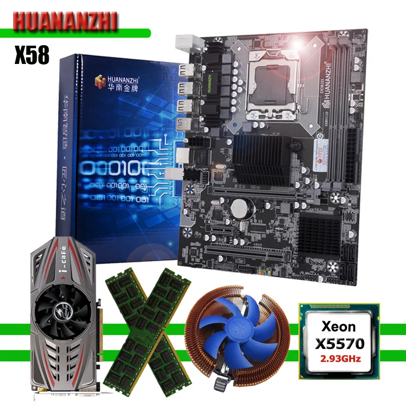 X58 LGA1366 motherboard+Xeon X5570 2.93GHz CPU+2*8G DDR3 RECC+cooler+cooler adapter+SATA cable+metal back shield+driver disc+user manual+GTX750Ti 2G DDR5 video card