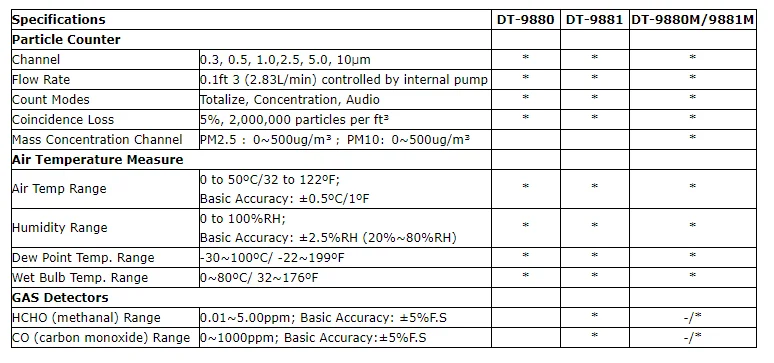 DT-9880/9881/9880M/9881M-счетчик частиц с 2,8 "цветным TFT ЖК-дисплеем и картой памяти microSD для захвата изображений (JPEG) или видео (3GP) для просмотра на вашем ПК, обеспечивая быстрые, легкие и точные показания для счетчика частиц, детекторов газа (HCHO,CO), температуры воздуха и относительной влажности. Это первое сочетание этих измерений в мире, будет лучшим инструментом для защиты окружающей среды и энергосбережения. Измерение температуры точки росы будет очень видимым для влажной и сухой защиты. Это хорошая рука для промышленных измерений и анализа данных, реальная сцена и время могут отображаться на цветном TFT LCD. Любые показания памяти можно записывать на SD-карту. Пользователь может быть снова в офисе для анализа измеренного качества воздуха под поддержкой программного обеспечения.