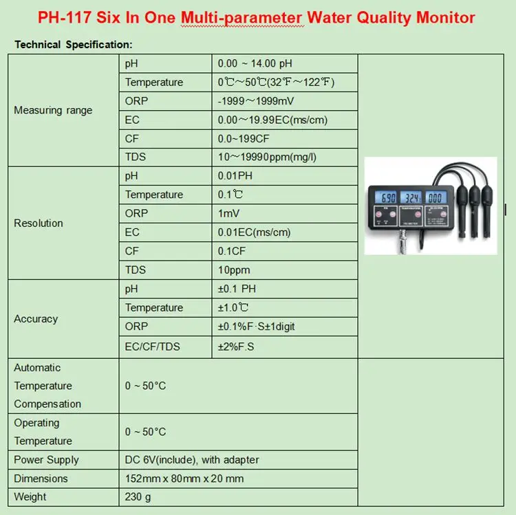 Этот новый монитор качества воды является профессиональным и необходимым инструментом для тестирования ORP / PH/температуры/EC / CF / RH / TDS уровня раствора. Подходит для аквариумного бассейна, лаборатории и окружающей среды.