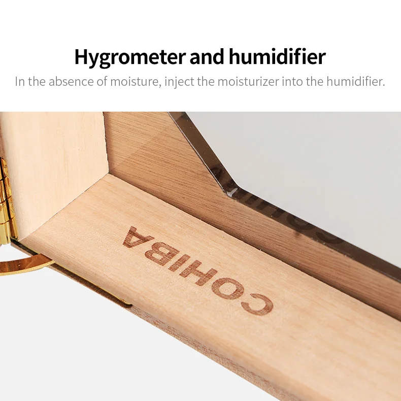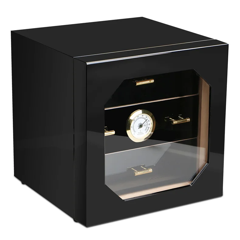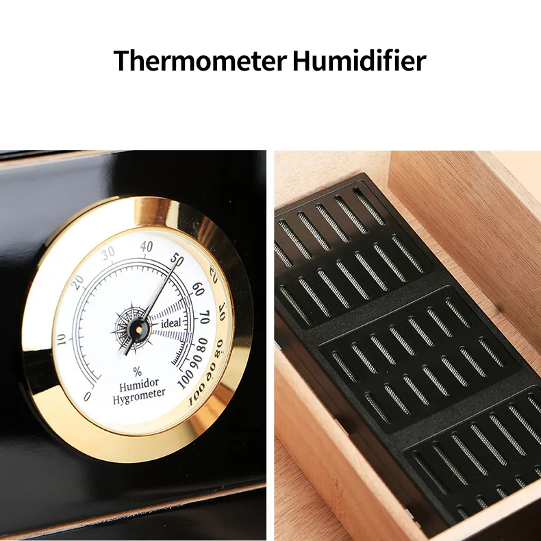 С точным гигрометром и увлажнителемТрехслойные ящики, хорошее покрытие для сигарКаждый ящик с разделителемБлестящая блестящая отделкаЗолотые петли и ручка