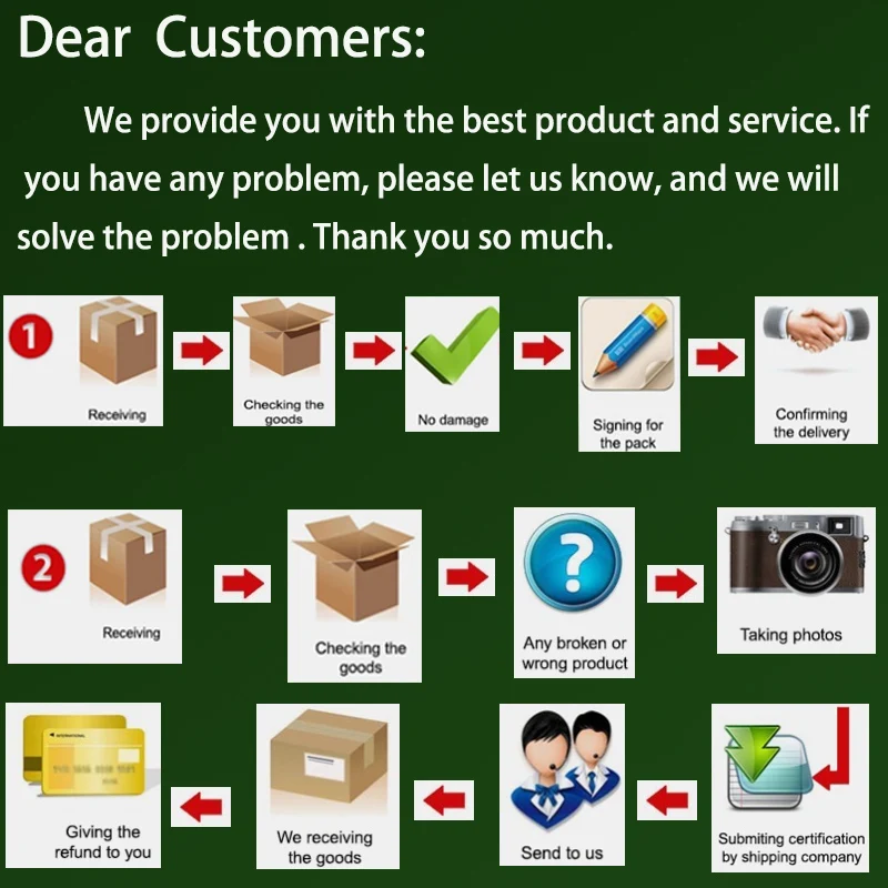 Как только посылка имеет проблемы, например, посылка повреждена, дефекты, утеряны (Bec международная доставка имеет любой случай). ... Пожалуйста, свяжитесь с нами. Мы постараемся сделать все возможное, чтобы решить проблему. Если вы недовольны своей покупкой, мы с радостью примем товар (ы) обратно и можем предложить полный возврат или обмен.