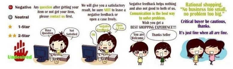 3. Если вы обнаружите что-либо, что вас не устраивает, пожалуйста, свяжитесь со мной, прежде чем оставить отрицательный/нейтральный отзыв или открыть спор. Мы решим проблему для вас дружелюбно и быстро. Свяжитесь с нами, это лучший способ решить проблему. Мы ценим Ваш опыт покупок, мы всегда стараемся сделать лучше.