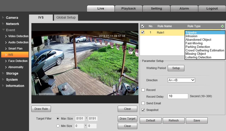 IVS : Tripwire, Intrusion, Object Abandoned/Missing,Fast-Moving,Parking Detection,Crowd Gathering Estimation,Loitering Detection