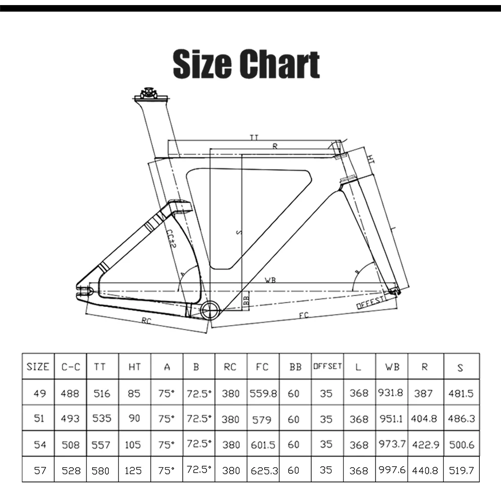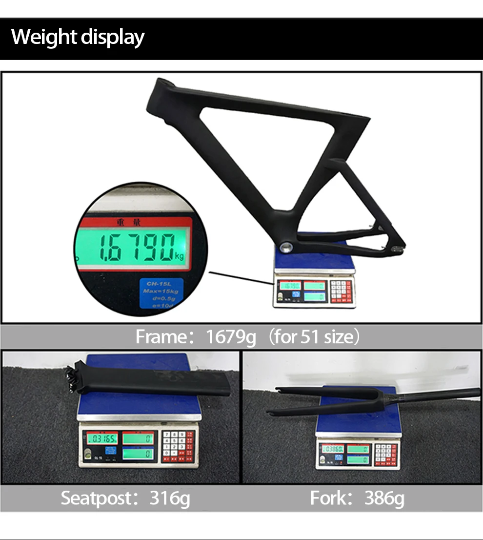 T800 карбоновая рама Комплект рамы: рама + вилка + гарнитура + подседельная стойка Материал: углеродное волокно Toray T800 UD Вес: 1679 +-50 (размер 51 см) Подходящий Нижний Кронштейн: BSA Отделка: матовая/глянцевая Материал: углерод Доступные размеры: 49/51/54/57 см