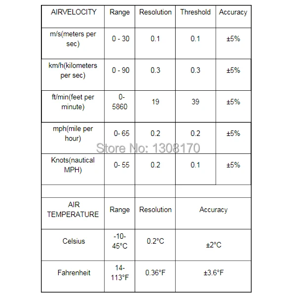 Скорость воздуха/скорость:M/S, km/H, Ft/min., Узлы, mph Температура воздуха:°C / °F Специальные функции:Скорость ветра/скорость: ток (Cu); Максимальная (макс.) и средняя (AVG) Sapphireball подшипник Термометр NTC Рабочая среда Температура: -10 ~ 45 °C(14 ~ 113 °F) Влажность: менее или 90% относительной влажности Температура хранения:-40 ~ 60 °C, -40 ~ 140 °F Около 3 мА потребление тока Источник питания: 1 х CR2032 3VBattery Размер: 105x40x15 мм Вес: 52 г (включая батарею и ремешок)
