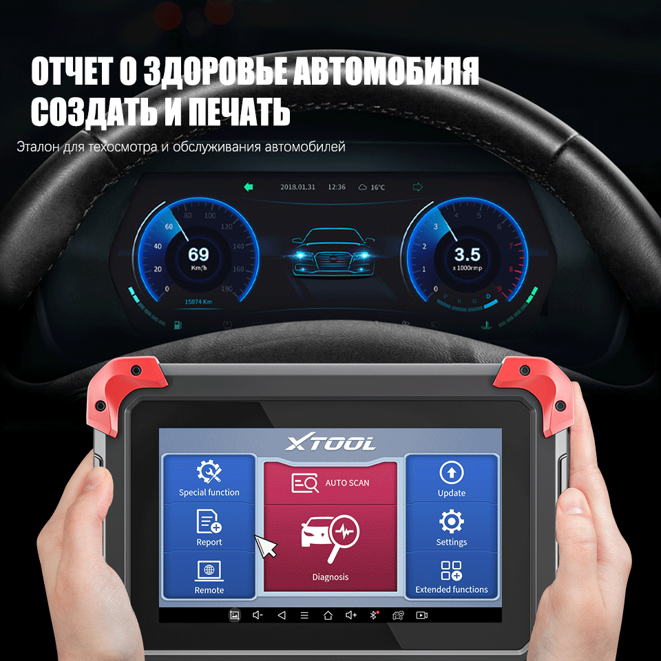 С помощью XTOOL D7 вы можете создать полный системный диагностический отчет одним щелчком. Отчеты могут быть отправлены по электронной почте в офис или непосредственно вашему клиенту. Вы также можете распечатать карту здоровья транспортного средства.