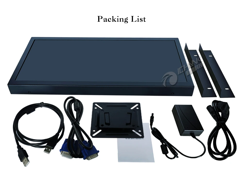 Монитор * 1/Адаптер питания * 1/Кронштейн для настенного монтажа * 1/Кронштейн для открытой рамы * 2/Кабель USB * 1/Кабель VGA * 1/Руководство пользователя * 1 (общая версия, только для справки);