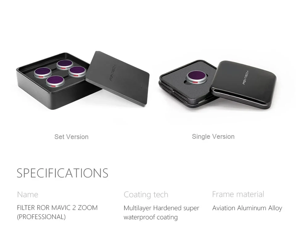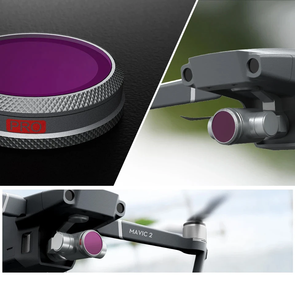Каждый фильтр весит всего от 0,8 до 1,2 граммов и не влияет на производительность камеры или дальность полета. Цветное покрытие высокого качества, простая установка, соответствует экологическим стандартам ЕС ROHS в отношении ограничений вредных веществ