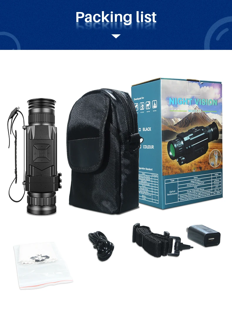【 5 】 с usb-портом и портом передачи видео. Быстрая и простая передача данных с помощью usb-кабеля, просмотр изображений и видео на мониторе с видео, а также подзарядка аккумулятора с помощью разъема DC IN. Монокуляр может использоваться для съемки фотографий или видеосъемки днем или ночью.