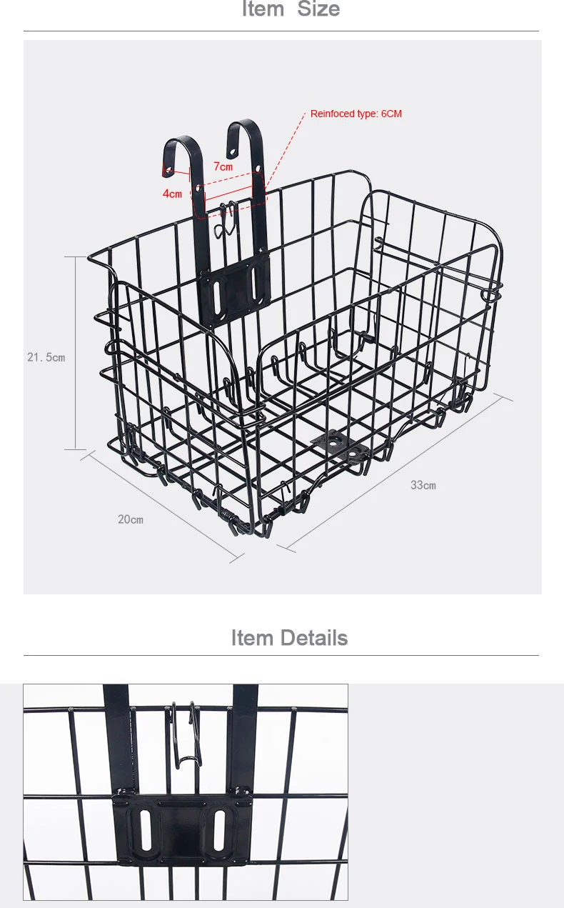 -Крепление на велосипеде: руль или багажник/переноска -Материал: железо, сталь, окрашенная в черный или серебристый цвет -Форма: складная -Максимальная грузоподъемность: 10 кг (усиленный тип) -Крепление: детали или винты прилагаются -Размер: прибл. 33*21,5*20 см, подробно показано в графика ниже -Вес нетто: прибл. 1300 г (усиленный тип)