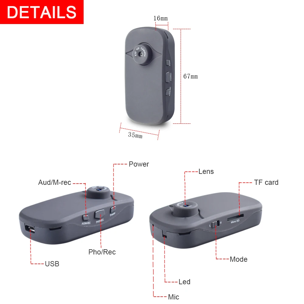 1) Датчик изображения: HD CMOS сенсор; 2) Угол обзора: 70 градусов; 3) Минимальное освещение: 1 люкс или более 4) Емкость аккумулятора: 600 мАч 5) Время непрерывной записи: около 180 минут 6) Температура хранения: от-10 до 70 градусов 7) Скорость: от 25 до 30 8) Тип карты памяти: карта TF (Micro SD) 9) емкость карты памяти: Поддержка 2-32 Гб 10) Разрешение видео: 1920*1080 или 1280*720 11) Разрешение изображения: 12 м (4032*3024) 12) интерфейс адаптации: USB2.0, USB1.1 13) Система поддержки: XP / Vista32 / WIN7 / WIN8 / WIN10, Mac OS 14) батарея работает полный рабочий день: 3 часа 15) Рабочая влажность: 15 ~ 85% RH9