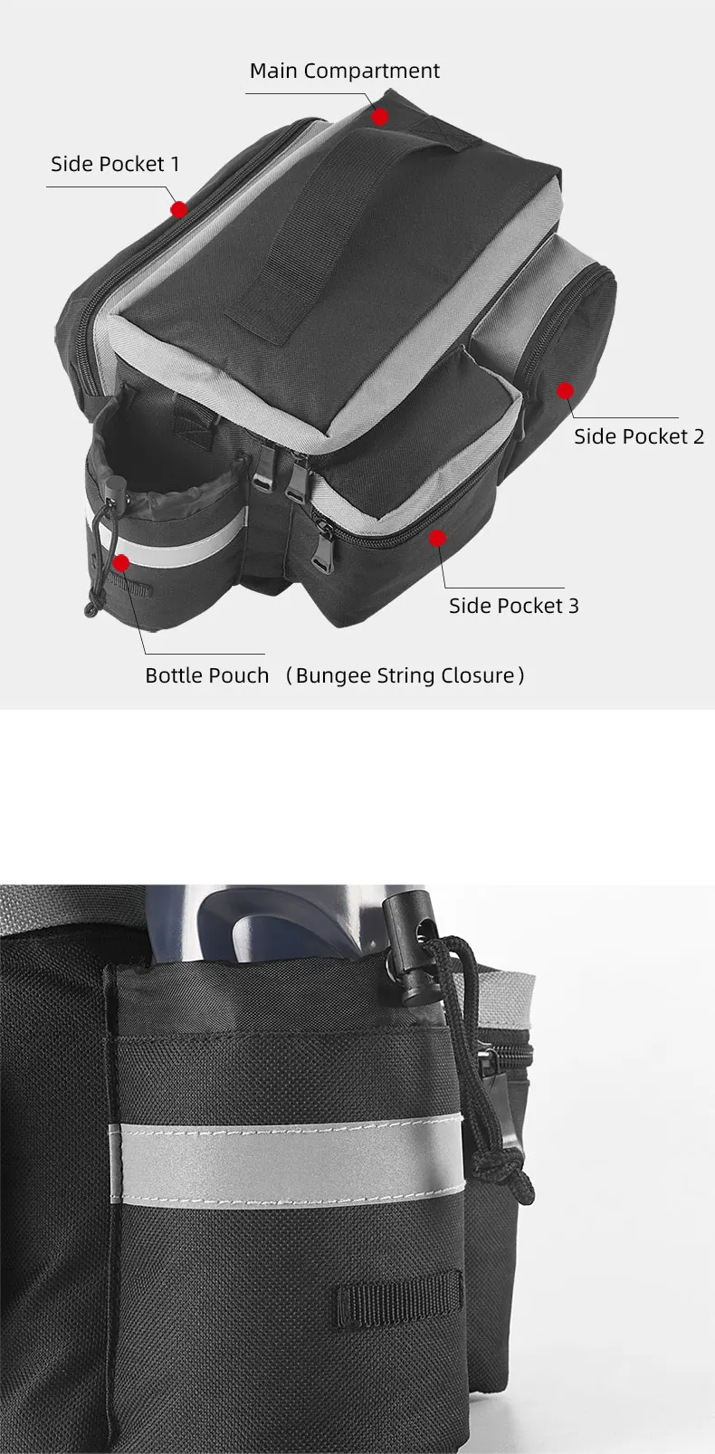-Структура: 1 основной карман, 3 боковых кармана и 1 мешочек для бутылки с водой