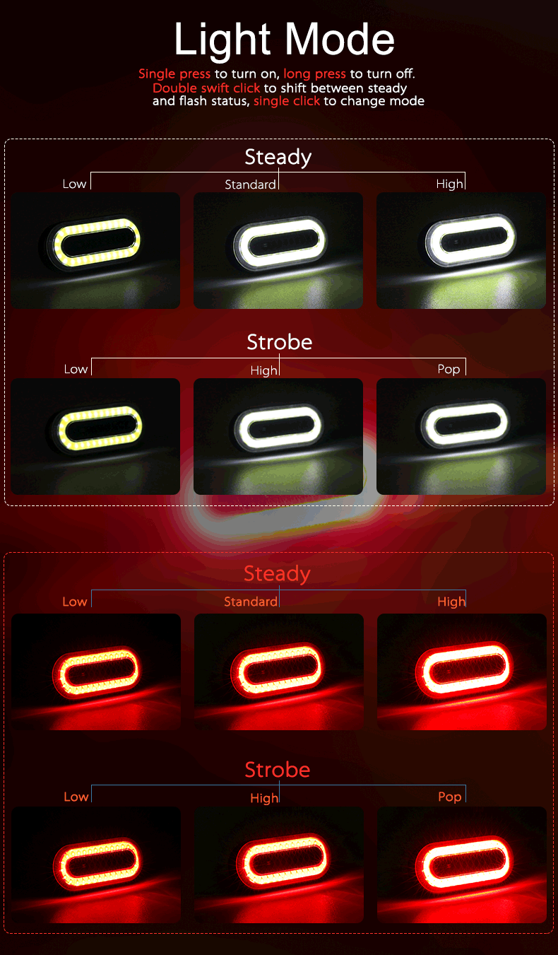 -6 режимов освещения для удовлетворения потребностей езды на велосипеде: 3 вспышки и 3 устойчивые;