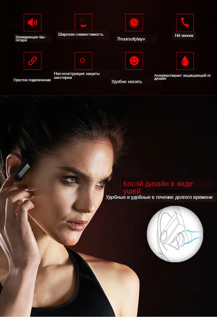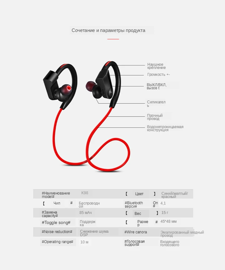 Технические характеристики 1. Новейшие технологии Bluetooth V4.1 2. Длительное использование аккумуляторы повышенной емкости 3. Стерео сабвуфер 4. Поддержка микрофона высокой четкости Посылка включает в себя: Bluetooth гарнитура Спорт 1 bluetooth гарнитуры 1 буклет 1 кабель для зарядного устройства 2 пары наушников Технические 1. La última фирма "Bluetooth V4.1 2. Uso a largo plazo de baterias de alta capacidad. 3. Сабвуфер estereo 4. Soporte de microfono de alta definicion. Рю incluido: Deporte bluetooth-гарнитуры 1 ушной раковины 1 folleto 1 кабель, цвета в ассортименте 2 pares de auriculares Товары Fotos: