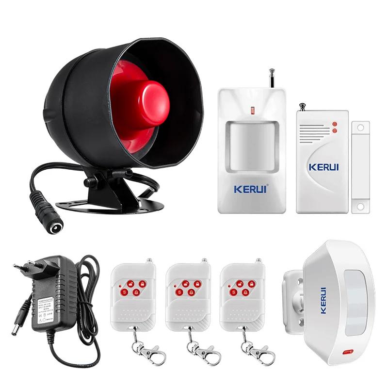 Kit81x хост-устройство динамика1xPIR детектор с батареей1x Windoor датчик двери с батареей1xKERUI P817 занавес инфракрасный аккумулятор в комплект не входит3x пульт дистанционного управления с батареей1x адаптер 9V1A для динамика сирены (США/Великобритания/Австралия/ЕС мы отправим вам правильный адаптер питания на основе вашей страны)1x руководство на английском языке