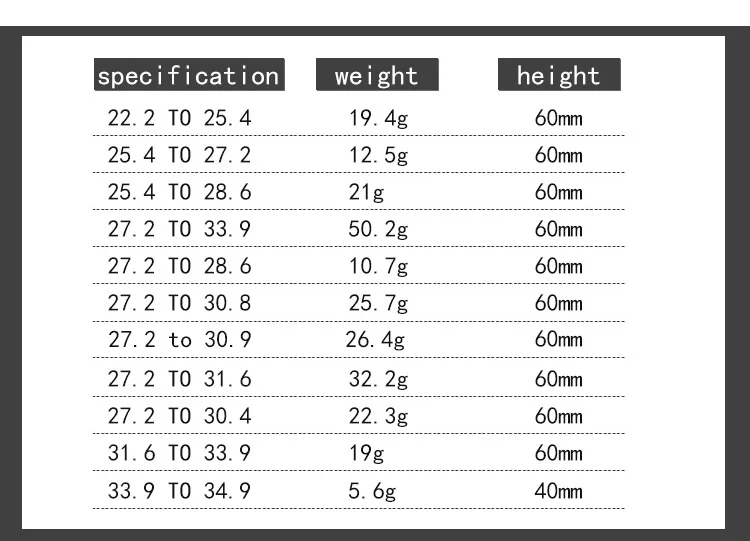 Бренд: muqzi Наименование: редуктор трубы сиденья CNC подвергая механической обработке Анодирование поверхности Материал: алюминиевый сплав Как выбрать: Сначала Измерьте внутренний диаметр трубки в рамку и наружного диаметра на подседельную трубу рамы Вы можете узнать характеристики рукава редуктора. Спецификация: 22,2 до 25,4 25,4 до 27,2 25,4 до 28,6 27,2 до 33,9 27,2 до 28,6 27,2 до 30,8 27,2 до 30,9 27,2 до 31,6 27,2 до 30,4 31,6 до 33,9 33,9 до 34,9 Вес показан ниже