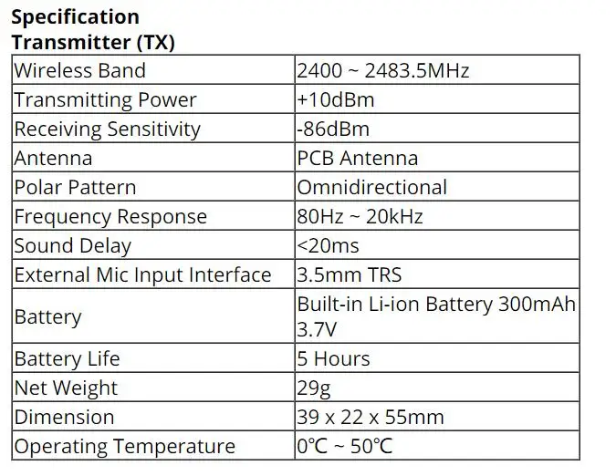 Основные характеристики . 2,4G Цифровая беспроводная, Глобальная свободная частота . Двойные передатчики, срабатывающие одним приемником . Визуальная мощность, аудио динамический монитор и другие функции отображения . Внутренний и внешний микрофон два входных режима . Моно/стерео переключаемые режимы вывода . Аудио монитор в реальном времени . Качество вещания аудио . Технология RF, Auto Freq. Регулировка, стабильная передача . Низкая задержка <20 мс . Рабочий диапазон до 50 м . Разработан с многофункциональным зажимом для ремня и компактным Уведомление . Из-за беспроводных характеристик 2,4G, пожалуйста, держите лицо лицом к лицу при использовании, и не Поворачивайте назад к приемнику, в противном случае легко генерировать точки останова, что является нормальным явлением. . Не блокируйте положение антенны, чтобы избежать возникновения плохого сигнала. . Пожалуйста, обратите внимание, что он не может реализовать функцию стерео в режиме one-trigger-one. . При использовании на мобильный телефон, пожалуйста, включите WIFI и Bluetooth, чтобы избежать беспроводных помех 2,4G. . Этот продукт относится к высокоточным инструментам, Пожалуйста, избегайте падения, столкновения или удара. . Не используйте это оборудование вблизи источника тепла или источника помех, таких как радиатор, духовка, холодильник или кондиционер, смартфон или рядом с WIFI AP. . Если расстояние захвата близко или при использовании на открытом воздухе, пожалуйста, установите ветряную муфту, чтобы предотвратить звук лопасти или уменьшить шум ветра. . Не используйте оборудование под дождем или во влажной среде, чтобы избежать опасности короткого замыкания. . Пожалуйста, храните продукт в сухом месте. Упаковочный лист Основные части: Передатчик (TX) Приемник (RX) Приемник UC (UC RX) Несколько вариантов: D1 = TX + RX D2 = TX + RX UC1 = TX + UC RX UC2 = TX + UC RX Аксессуары: Подходит для: ① 3,5 мм Mic Аудио Вход кабель ②Wind халява уха ③ 3,5 мм TRS-TRRS аудио кабель ④ Отделение для удостоверения личности-3,5 мм TRS-TRS аудио кабель ⑤Зарядный кабель USB A-USB C ⑥Reset Pin-код ⑦User руководство ⑧Warranty карты Аксессуары каждой комбинации включают в себя: D1 = подходит для: ① + ② + ③ зарядное устройство + ④ отделение для удостоверения личности-+ ⑤ + ⑥ + ⑦ световой индикатор + ⑧ D2 = ① x2 + ② x2 + ③ + ④ + ⑤ + ⑦ + ⑧ UC1 = подходит для: ① + ② + ⑤ + ⑥ + ⑦ световой индикатор + ⑧ UC2 = ① x2 + ② x2 + ⑤ + ⑥ + ⑦ + ⑧Сделала заказ на сайте этого интернет-магазина. Конечно, затребовали предоплату, что я и сделала, почитав отличные отзывы. Пришло письмо о... Читать отзыв полностью...