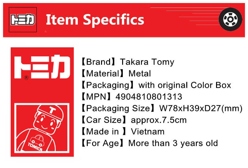 Номер товара. : 4904810801313 Производитель: TAKARATOMY Бренд: Tomica Размер посылка: W78 x H39 x D27 мм Целевой возраст: 3 года ~
