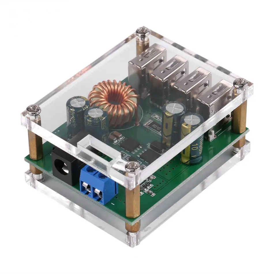 С функцией защиты: защита от обратной полярности, перегрузки по току и перегрева. Режим проводки-постоянный ток 5,5/2,1, клеммы-не пайки, поэтому их удобно устанавливать. Применение в мобильном питании, мобильном телефоне, планшетных компьютерах, рекордерах и других USB 5 V оборудовании питания. Этот преобразователь может выдерживать максимальный ток 5А, если ваше оборудование в 5А токе может быть использовано, ток является адаптивным. Этот выходной понижающий преобразователь с 4USB, особенностиАвтоматическая идентификация, иСовместим с большинством устройств.
