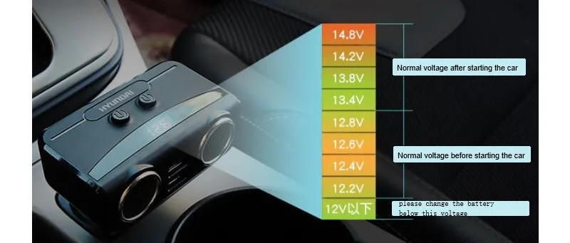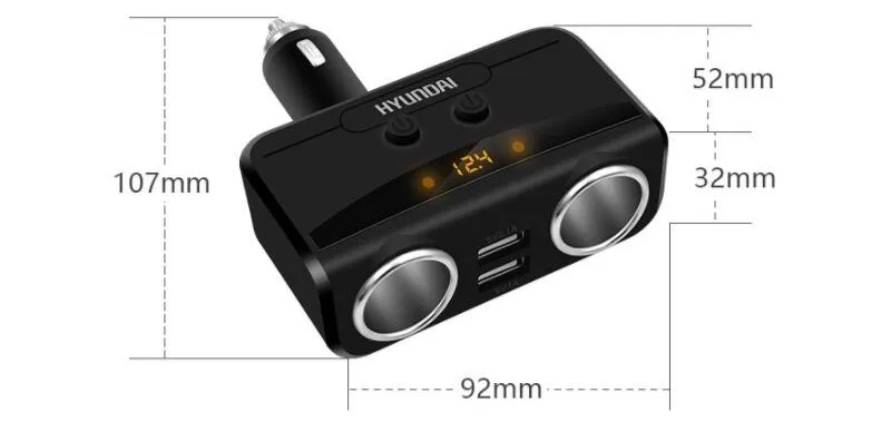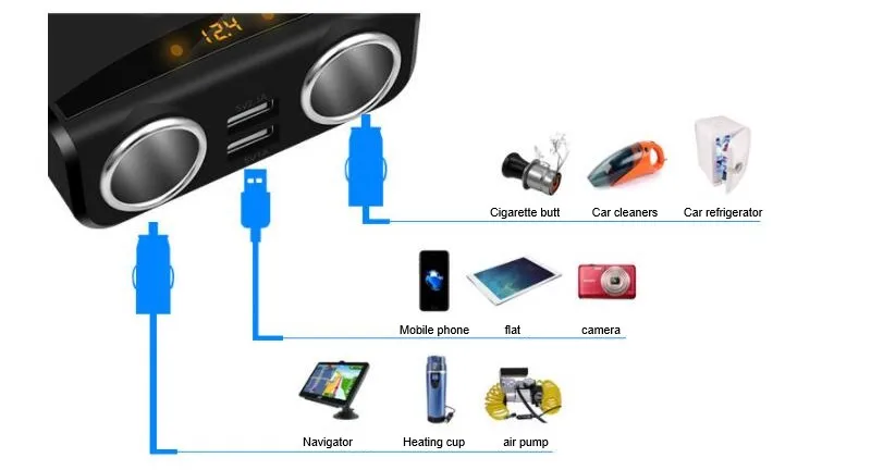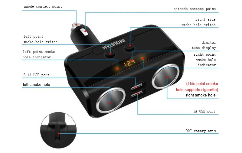 1. Двойная зарядка USB: 5 В/3,1 а умное распределение тока 2. Двойные отверстия для прикуривателя, совместимые с различными устройствами для подключения прикуривателя. 3. Независимый Оригинальный прикуриватель, поддержка подключаемого прикуривателя 4. Интеллектуальное автоматическое обнаружение напряжения автомобильного аккумулятора, мониторинг состояния батареи в реальном времени 5. Светодиодный дисплей показывает напряжение батареи в реальном времени 6. Совместимость с основными моделями (12-24 В) 7. Регулируемый угловой вал, вращение на 90 градусов, простота в использовании и экономия пространства 8. С независимым переключателем, двухпортовым ограничением тока и ограничением напряжения интеллектуальная защита, поддержка быстрой зарядки, перегрева, перенапряжения и защиты от перегрузки по току 9. Кнопка управления прикуривателем имеет световой индикатор. Удобно для ночного инструкции 10. Высокоэластичные металлические контакты, надежно закреплены и не легко ослабляются