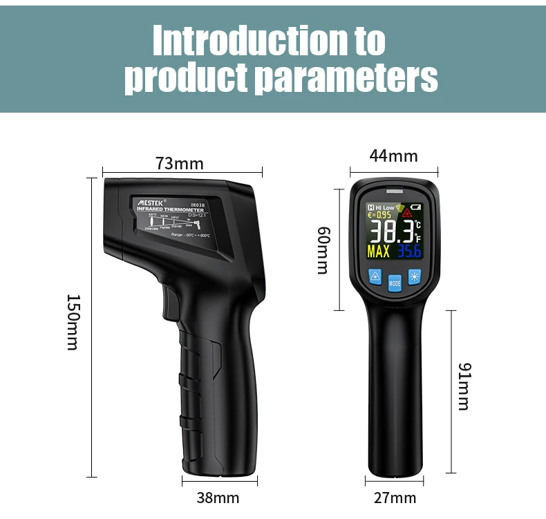 Высокая точность измерения, регулируемая излучательная способность, HD, цветной экран, высокая и низкая температура сигнализации, высокая и низкая температура сигнализации, отношение Расстояния объекта 12 : 1, блок переключатель, сохранение данных, автоматический сон, подсказка низкого заряда батареи