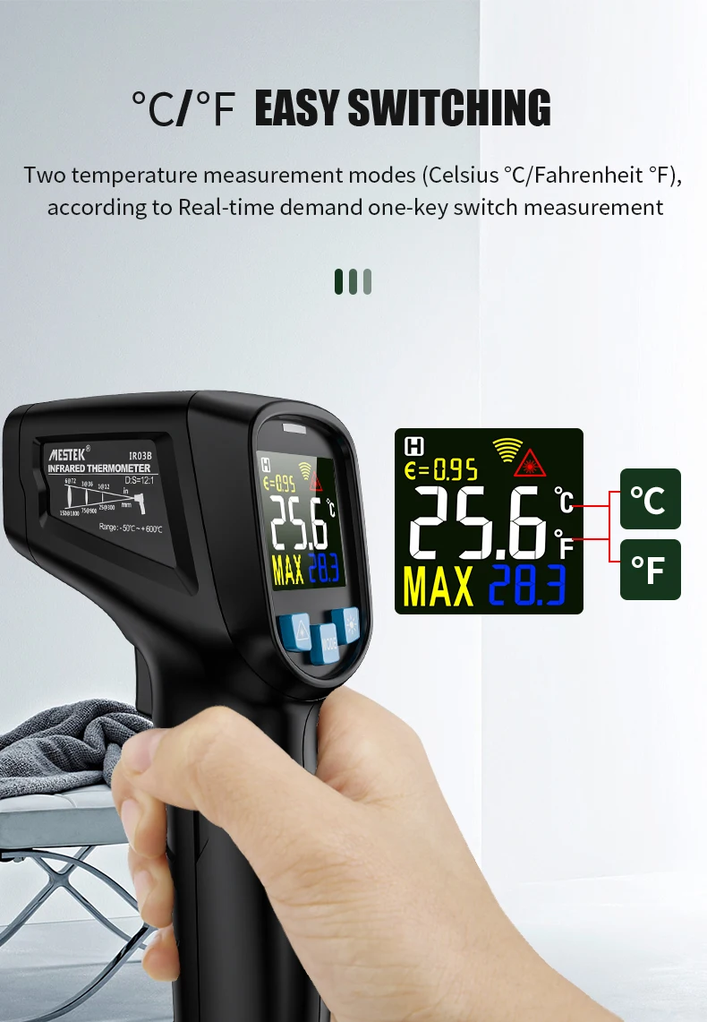 Два режима измерения температуры (по Цельсию C °/по Фаренгейту °F), измерение одним ключом в соответствии с потребностями в реальном времени