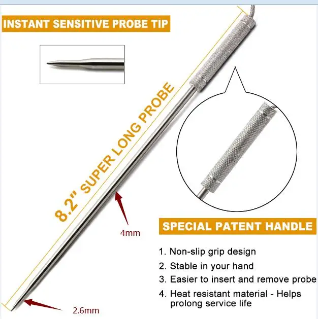 ● Запрограммирован с предварительно утвержденными температурами USDA для различных типов мяса. (Говядина, молотая птица, говядина, телятина, курица, свинина, птица, ягненок и рыба) ● Вы также можете настроить желаемую температуру, и она будет звучать, когда достигнет установленной температуры. ● Запрограммирован с предустановленными уровнями точности USDA для различных типов мяса. (Редкие, средние редкие, средние, средние и хорошо сделанные)