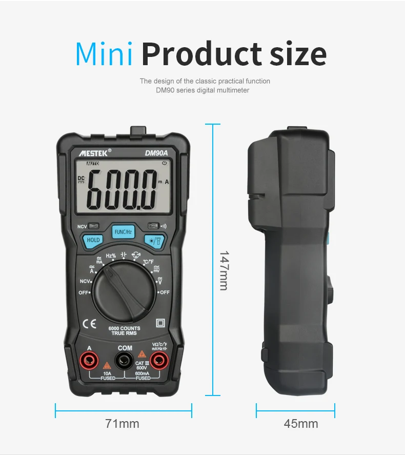 Измерение samrt, интеллектуальное переключение, 6000 подсчетов дисплея, напряжение переменного/постоянного тока, зуммер/диод ВКЛ./ВЫКЛ., Интеллектуальное распознавание, емкость, сопротивление, Бесконтактное испытание напряжения, T-RMS, подсветка/фонарик/1,5 v/9В батареи измерения, фиксация данных, Автоматическое отключение питания