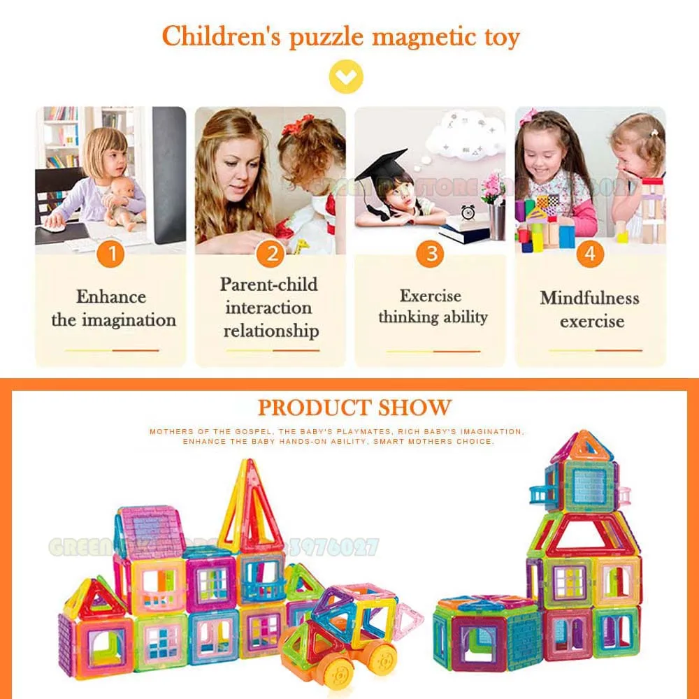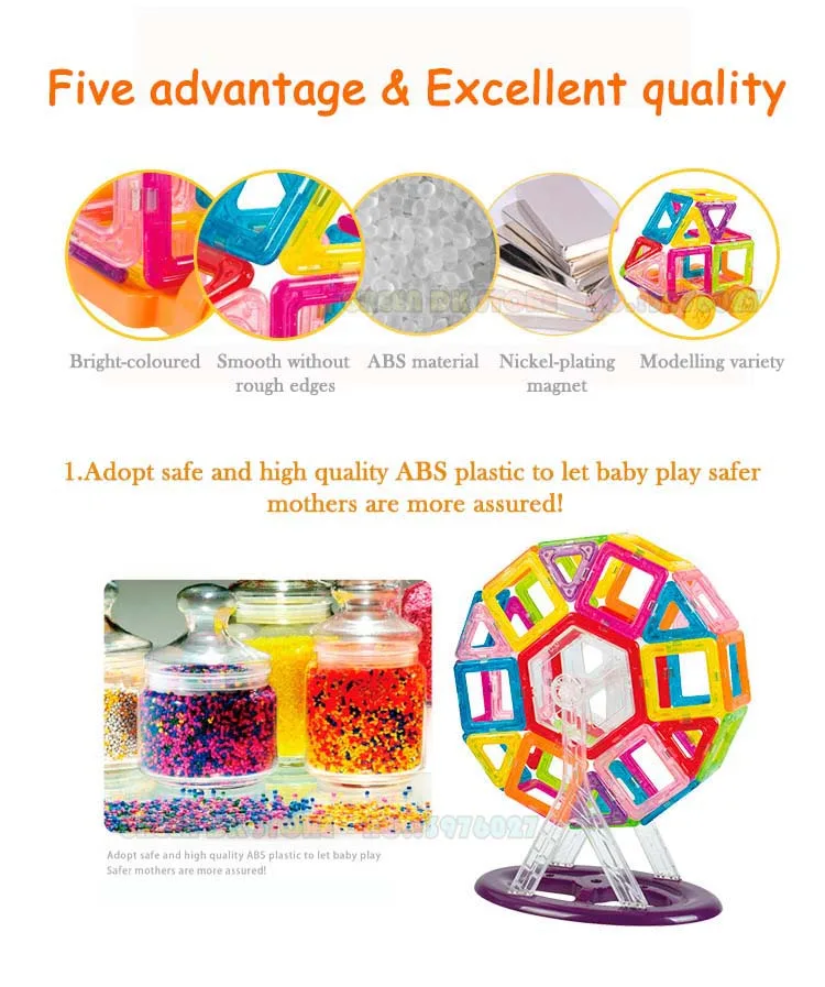 Опасения: 1. Пространственная способность помогает детям знать цвета и пространство. 2. Сделай Сам помогает детям улучшить их способность тренироваться. 3. Логическая способность помогает детям улучшить их логическое мышление. 4. Способность воображения стимулирует воображение детей. 5. Используя ультразвуковую технологию сварки, более устойчивы к падению, более основным является отсутствие клея, без добавления. 6. АБС-пластик высокого качества и сопротивления сжатия и зеленый и без загрязнения. 7. Дизайн дуги не повредит руку ребенка. 8. Постоянный магнетизм Natura.