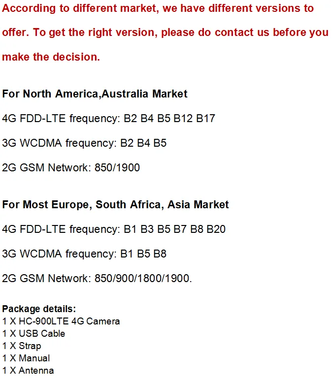 HC-900LTE-это охотничьи камеры MMS 4G, которые могут прислать 3 дополнительных размера супер четкие фотографии на номера телефонов 1-4, 1-4 фото адресов электронной почты и учетных записей FTP. По сравнению с другими камерами 2G 3G, эта охотничья камера 4G имеет лучшую емкость, потому что она охватывает более увядающие частоты сети (4G 3G и 2G сеть).