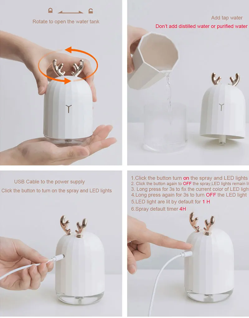 Стиль А Как использовать: 1. Нажмите кнопку включения распыления и светодиодных ламп 2. Нажмите кнопку еще раз, чтобы выключить распылитель, светодиодные фонари остаются горящими 3. Длительное нажатие для 3s, чтобы зафиксировать текущий цвет светодиодного светильника 4. Нажмите и удерживайте кнопку в течение 3 секунд, чтобы выключить светодиодную лампу 5. Светодиодная лампа горит по умолчанию в течение 1 ч 6. Спрей по умолчанию таймер 4H Стиль B как использовать: 1. Нажмите, чтобы открыть непрерывный спрей (продолжайте распыление около 12 часов) 2. Нажмите еще раз, чтобы начать прерывистый спрей (прерывистый спрей около 24 часов) 3. Третий щелчок на закрытом распылении, 4. Длительное нажатие в течение 3 ~ 5 секунд для включения/выключения ночника Соединяет пути: 1. Зарядное устройство для телефона 2. Дополнительный внешний аккумулятор 3. Usb-порт для ноутбука