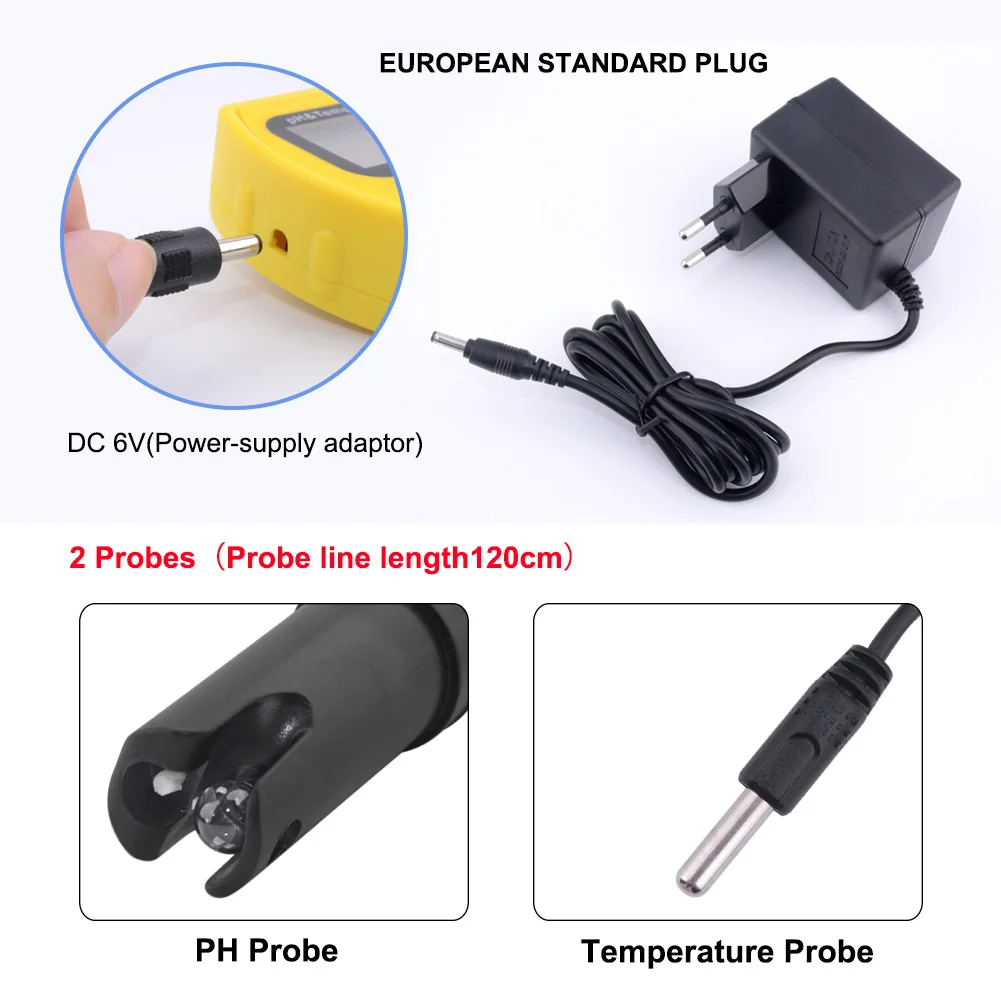 Автоматическое отключение Подсветка Дисплей Наблюдение в сетевом режиме Диапазон: pH 0,00 ~ 14,00 Температура: -50 °C ~ 70 °C (-58 °F ~ 158 °F) Разрешение: pH 0,01 Температура: 0,1 °C (0,2 °F) Точность: pH ± 0,1 Температура: ± 1,0 °C (± 2,0 °F) Компенсация температуры: 0 °C ~ 50 °C (32 °F ~ 122 °F) Температура окружающей среды: 0 °C ~ 50 °C (32 °F ~ 122 °C) Источник питания: 6 В постоянного тока (адаптер питания можно использовать) Батарея: 4 × 1,5 V ag-13-ти таблеточная батарейка батареи (не входит в комплект)