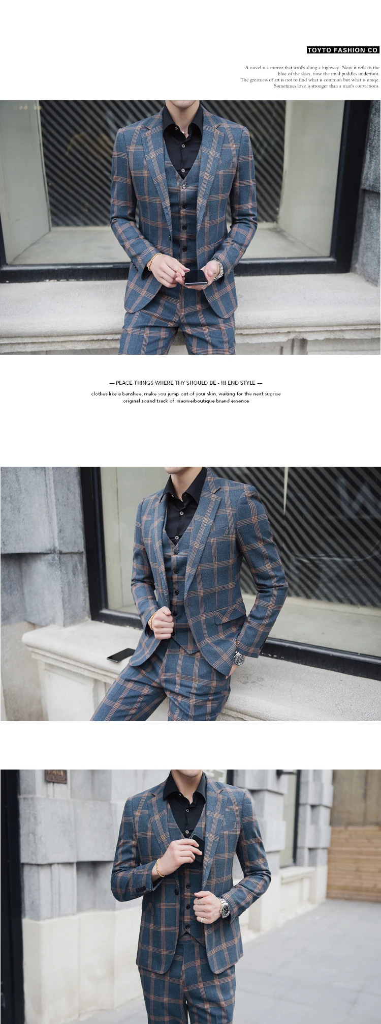 Мужские свадебные костюмы, комплект, синий и желтый клетчатый приталенный мужской костюм, брендовый Блейзер, мужской костюм, пиджак + жилет + брюки 5XL