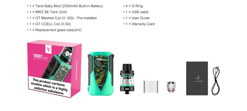1 Таро детский мод 1 NRG SE бак 1 0.18ohm GT сетчатая катушка 1 0.5ohm GT CCell катушка 1 запасная стеклянная трубка 1 USB зарядка 1 Руководство пользователя 1 гарантийный талон Упаковка со склада, упаковка может быть изменена без уведомления.