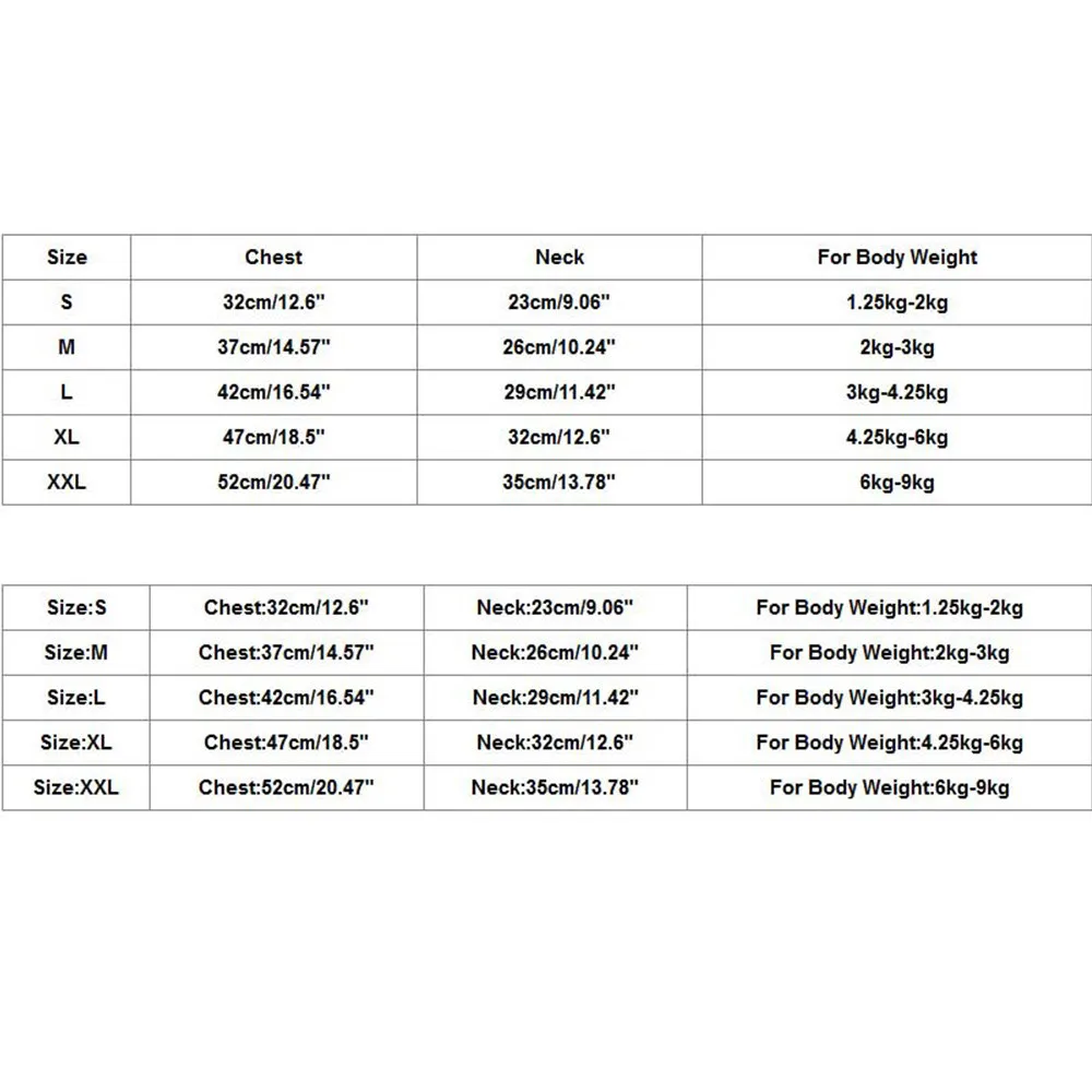 Размер Обхват груди Шеи Для веса тела S 32 см/12,6" 23 см/9,06" 1,25 кг-2 кг М 37 см/14,57" 26 см/10,24" 2 кг-3 кг L 42 см/16,54" 29 см/11,42" 3 кг-4,25 кг XL 47 см/18,5" 32 см/12,6" 4,25 кг-6 кг XXL 52 см/20,47" 35 см/13,78" 6 кг-9 кг