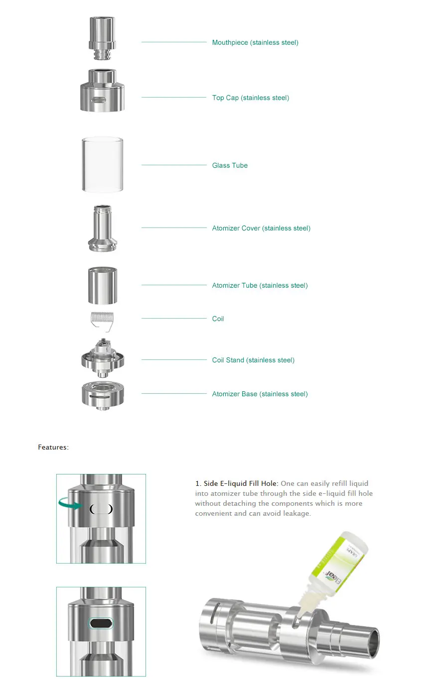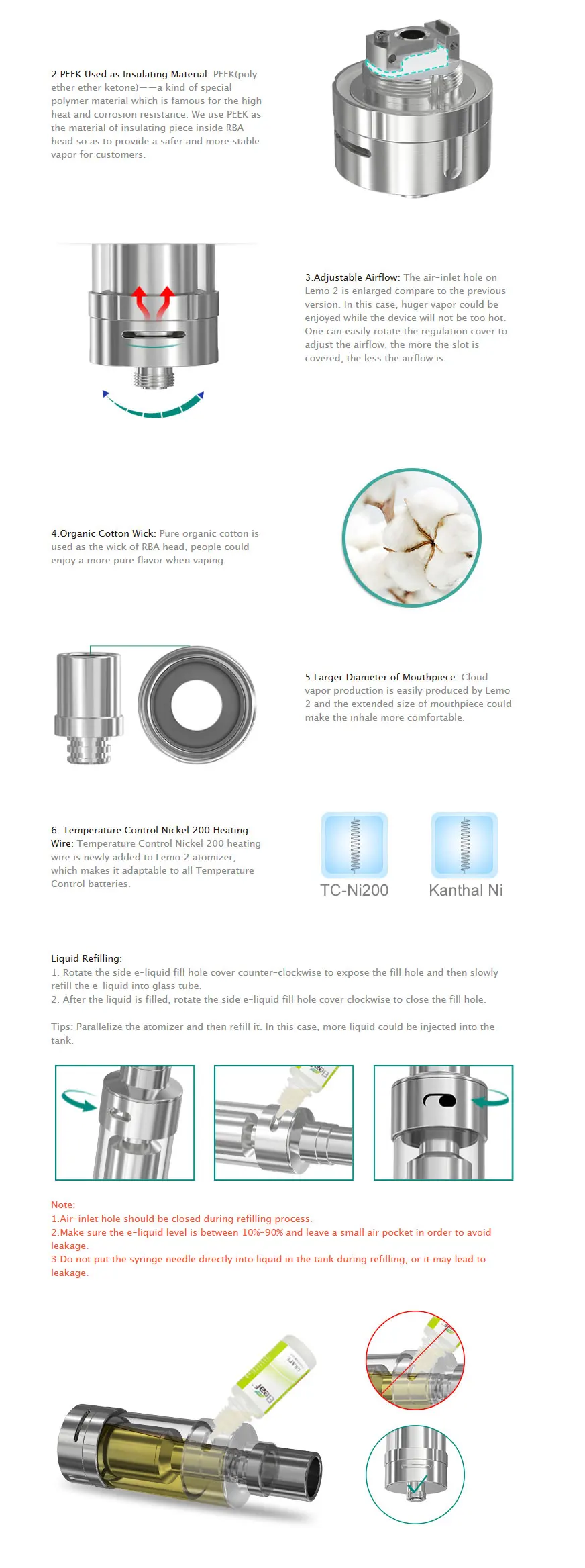 Lemo 2-это передовая версия известных атомайзеров серии Lemo, благодаря новому инновационному дизайну бокового отверстия для заполнения электронных жидкостей и использованию PEEK (известный высокий материал, устойчивый к нагреву и коррозии) изоляционного элемента. Вейп становится более безопасным и стабильным, и больше нет необходимости отсоединять атомайзер во время заправки. Процесс заполнения становится легче и утечки можно избежать. Наследство RBA head также увеличивает удовольствие от DIY опыта и может принести вам производство облачных паров.
