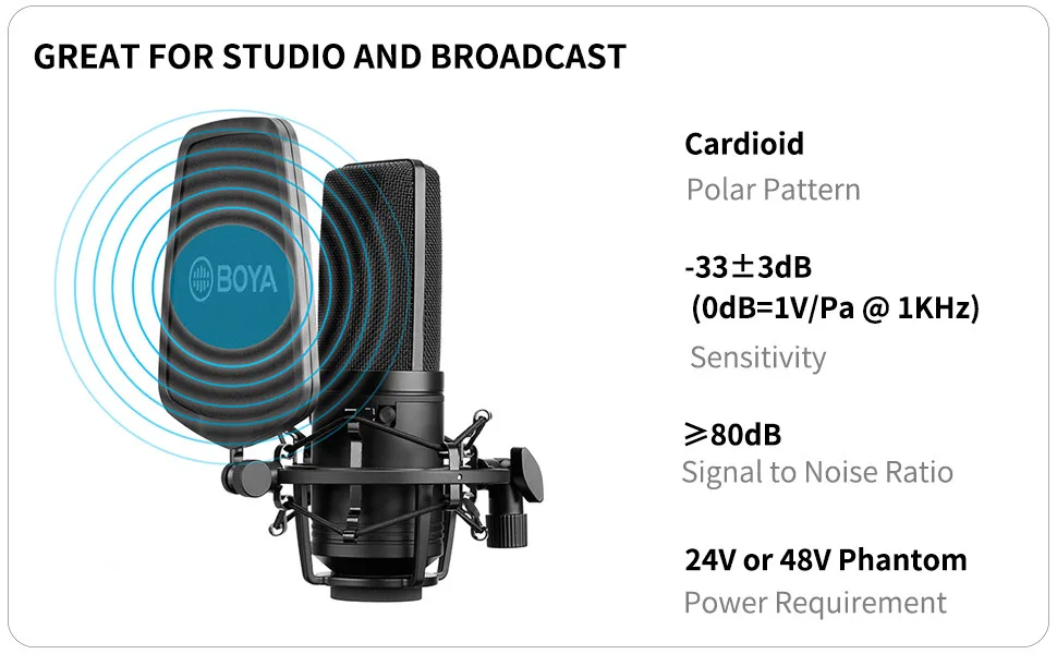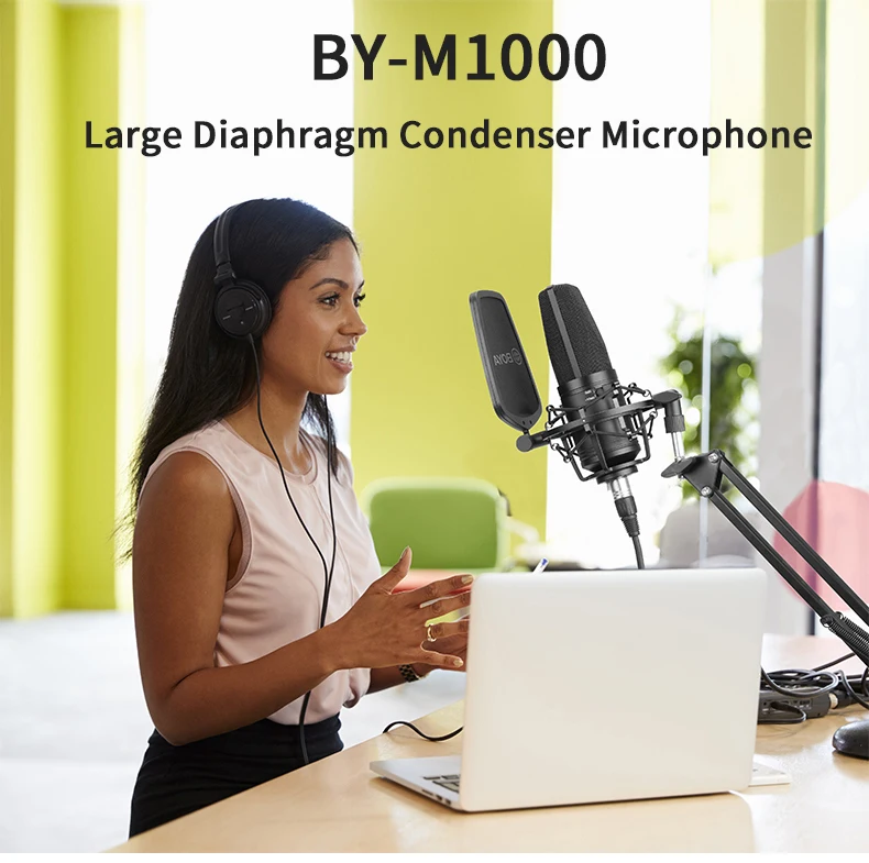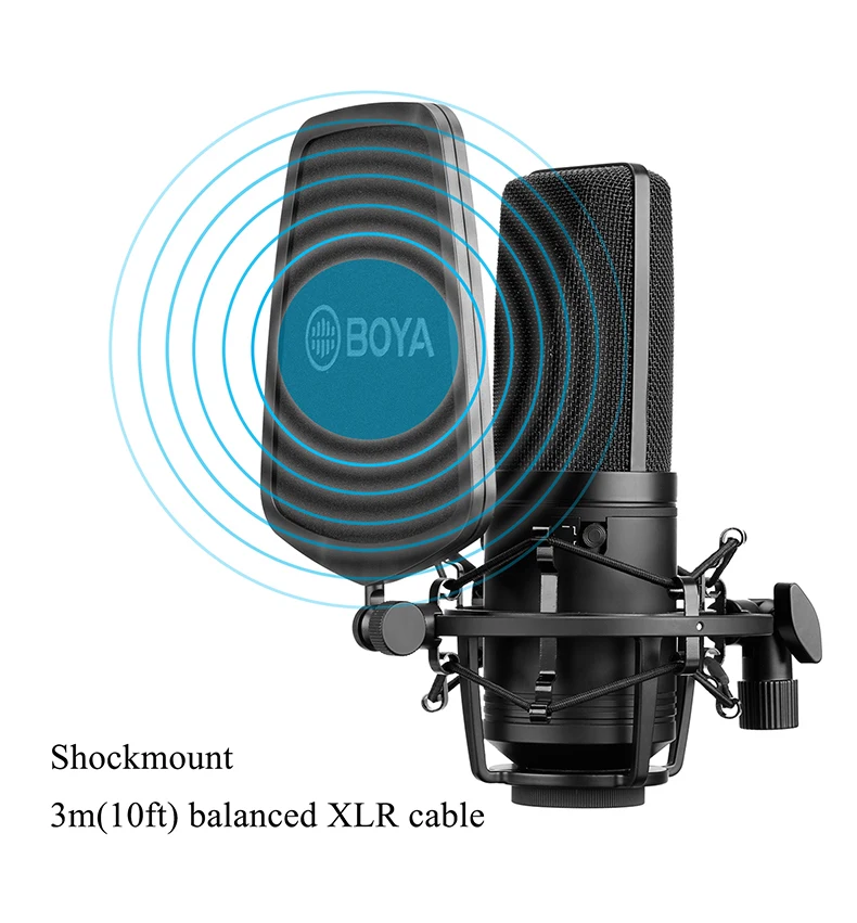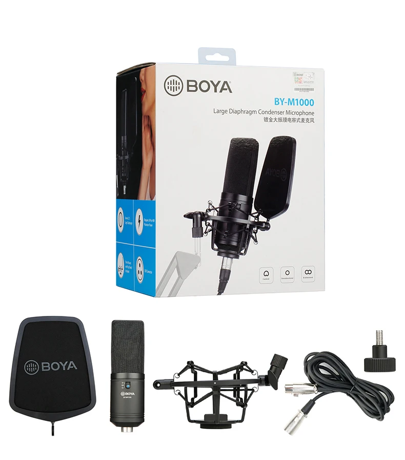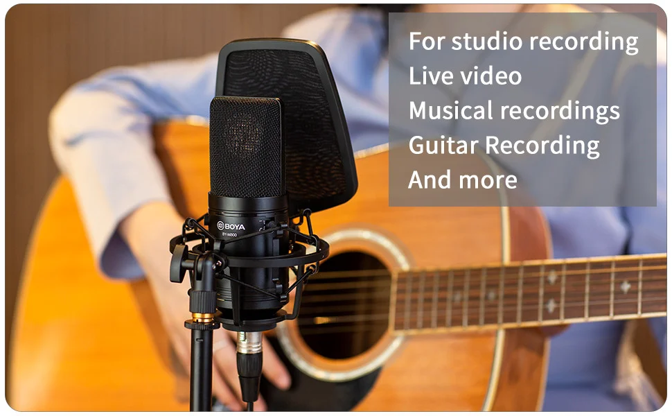 BOYA BY-M1000 подходит для захвата инструментов и вокала в проектных и профессиональных записывающих приложениях, таких как певцы, песенники, подкастеры, артисты voiceover, полевые рекордеры и записи домашней студии. Кроме того, микрофон обеспечивает частотную реакцию от 20 Гц до 20 кГц для точного воспроизведения аудиосигналов в различных диапазонах.