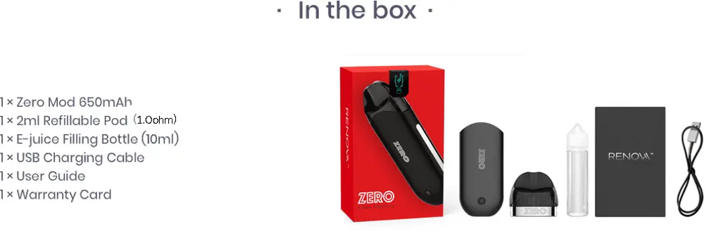 Что в упаковке: 1 x Zero Mod 650 мАч 1x2 мл многоразовый Pod(1.0ohm) 1 x бутылка для наполнения E-juice (10 мл) 1 х USB кабель для зарядки 1 Руководство пользователя 1 гарантийный талон