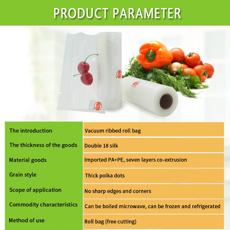 1. Пищевое PE и PA специальное сырье, Без пластификатора;2. Получили сертификаты QS, FDA, LFBG, BPA free и ROHS;3. Многослойный процесс коэкструзии, без остаточного клея, более Защита окружающей среды, защита пищевых продуктов не появляется замороженное пятно;4. Специальная микроканальная конструкция тиснения, полная Вытяжка Воздуха, хорошая герметизация, свежее время хранения до нескольких месяцев;5. Сумки и рулоны имеют различные характеристики, и ребристые рулоны можно разрезать на любую длину;6. Может быть заморожена, может быть Варена, микроволновая печь;7. Подходит для всех видов бытовой вакуумной упаковочной машины.