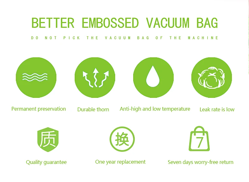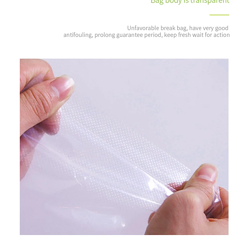 1. Пищевое PE и PA специальное сырье, Без пластификатора;2. Получили сертификаты QS, FDA, LFBG, BPA free и ROHS;3. Многослойный процесс коэкструзии, без остаточного клея, более Защита окружающей среды, защита пищевых продуктов не появляется замороженное пятно;4. Специальная микроканальная конструкция тиснения, полная Вытяжка Воздуха, хорошая герметизация, свежее время хранения до нескольких месяцев;5. Сумки и рулоны имеют различные характеристики, и ребристые рулоны можно разрезать на любую длину;6. Может быть заморожена, может быть Варена, микроволновая печь;7. Подходит для всех видов бытовой вакуумной упаковочной машины.