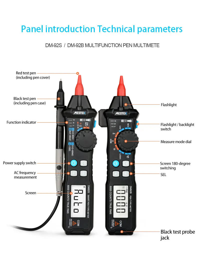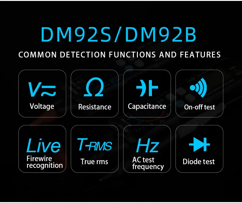 Пункт продажи для DM92B: Автоматический диапазон, обнаружение FireWire, измерение емкости, 180 градусов флип-экран Пункт продажи для DM92S: Умное измерение, обнаружение Firewire, измерение емкости, 180 градусов флип-экран