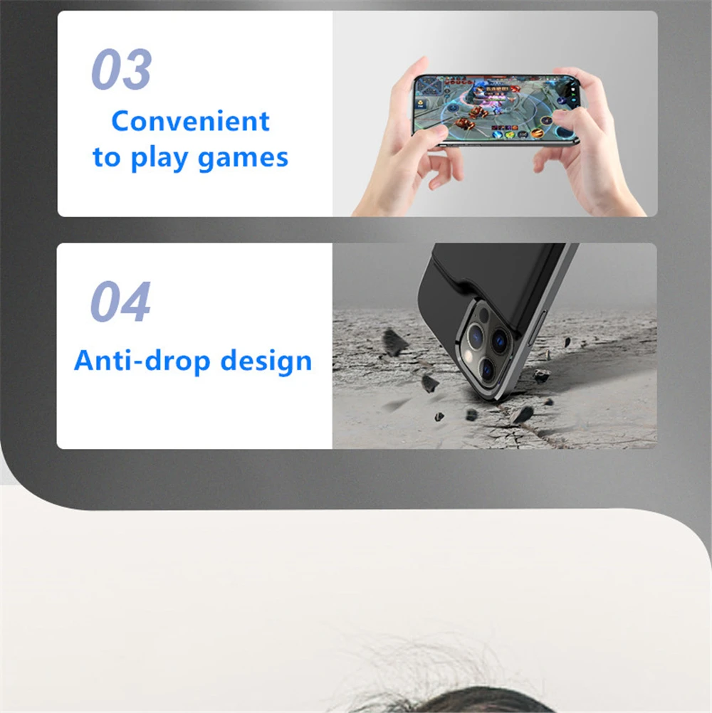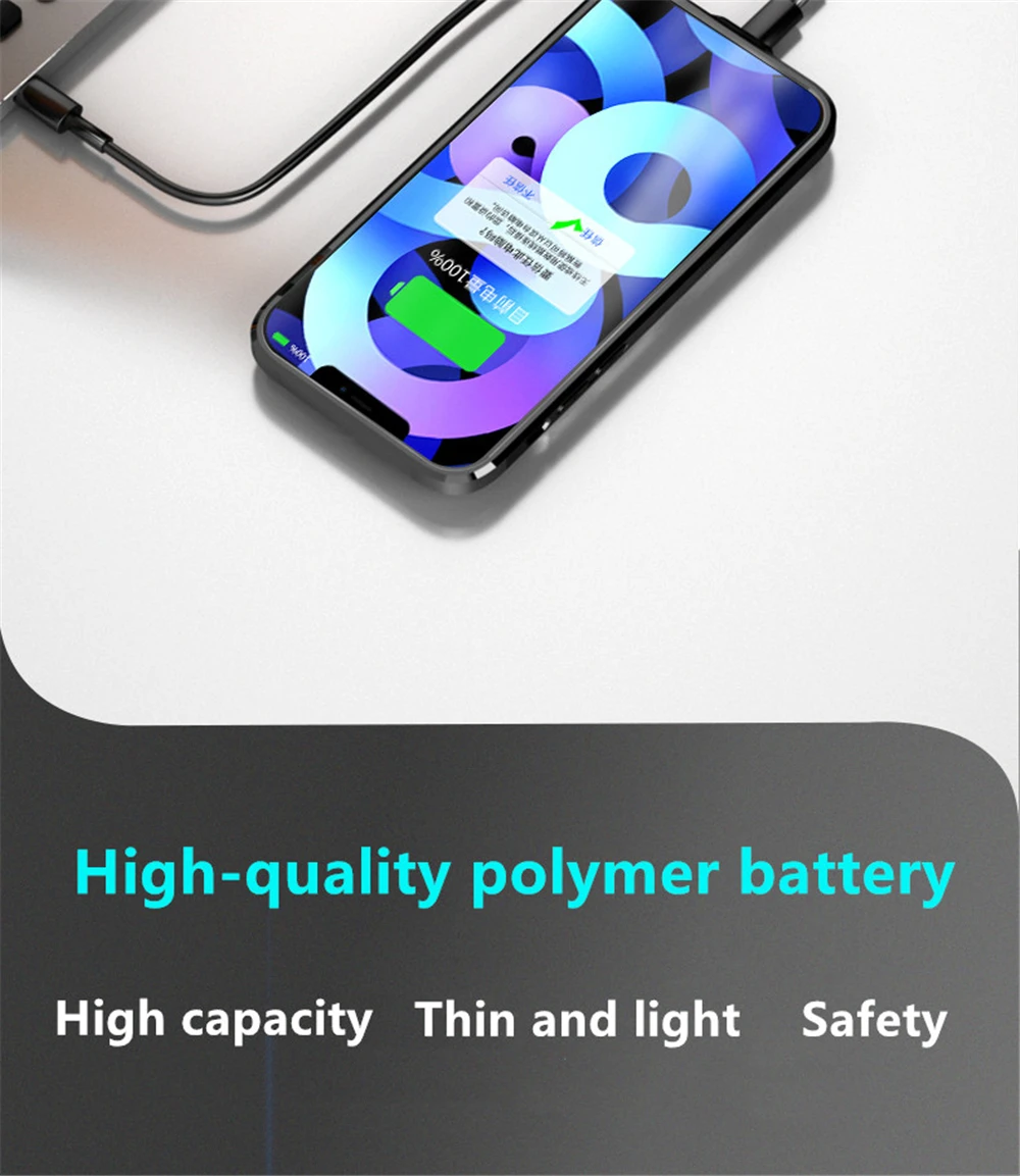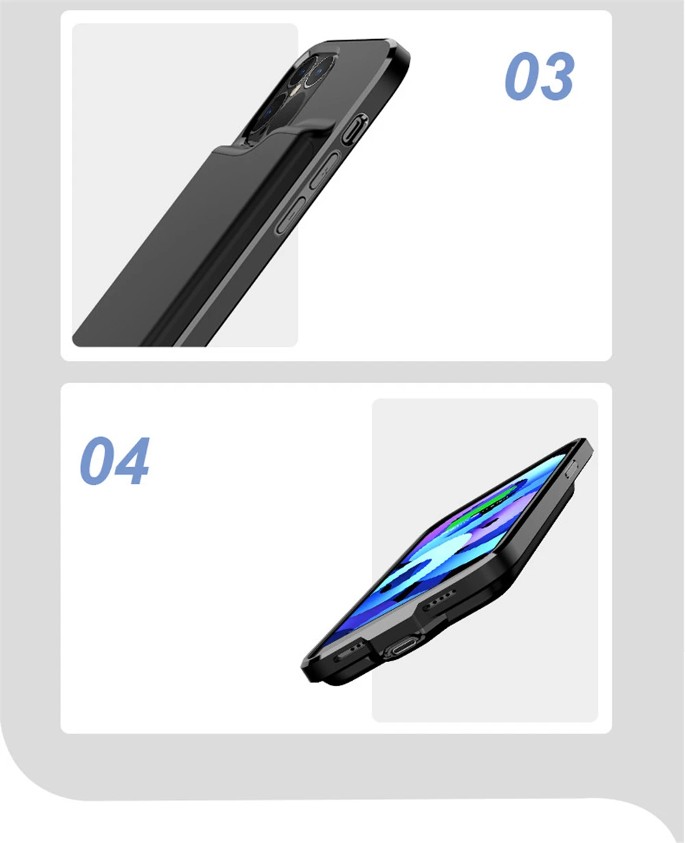 Эксклюзивный патент предназначен для iPhone 12 Mini/12 / 12 Pro / 12 Pro Max Тип товара: противоударный чехол для аккумулятора Вход: DC5V0.5A-1.5A (макс.) Выход: DC5V0.5A-1.5A (макс.) Рабочая температура: 0 ℃ -45 ℃ Температура хранения/транспортировки: -20 ℃ ± 50 ℃ продолжительность цикла: ≥ 500 раз Время зарядки для аккумулятора чехол: около 4-5 часов Время зарядки телефона: около 3-4 часов Вес изделия: 127 г Цвет: черный/синий/розовый/белый Светодиодный индикатор освещения показывает процент заряда батареи следующим образом: Один светодиодный: 1% ~ 25%; Два светодиодный: 25% ~ 50%; Три СВЕТОДИОДНЫЙ: 50% ~ 75%; Четыре СВЕТОДИОДНЫЙ: 75% ~ 100%. Для iPhone 12 мини (5,4 дюйма) 5200 мА-ч Для iPhone 12/12 Pro (6,1 дюйма) 5500 мА-ч Для iPhone 12 Pro MAX (6,7 дюйма) 5500 мА-ч